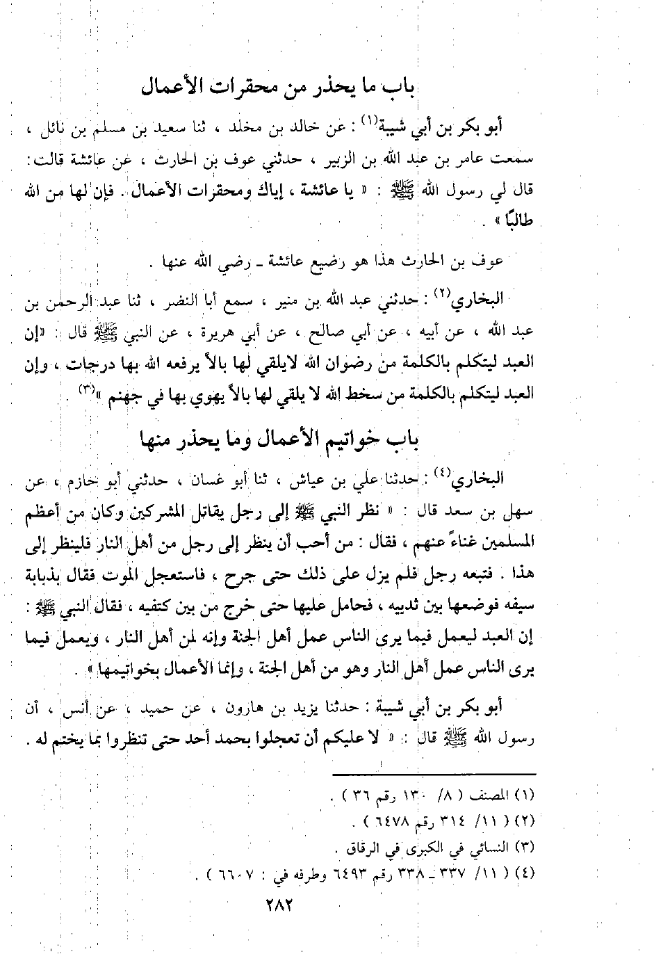 أَبُو بكر بن أبي شيبَة: عَن خَالِد بن مخلد، ثَنَا سعيد بن مُسلم بن نائل، سَمِعت عَامر بن عبد الله بن الزبير، حَدثنِي عَوْف بن الْحَارِث، عَن عَائِشَة قَالَت: قَالَ لي رَسُول الله - صَلَّى اللَّهُ عَلَيْهِ وَسَلَّم َ -: " يَا عَائِشَة، إياك ومحقرات الْأَعْمَال. فَإِن لَهَا من الله طَالبا ".