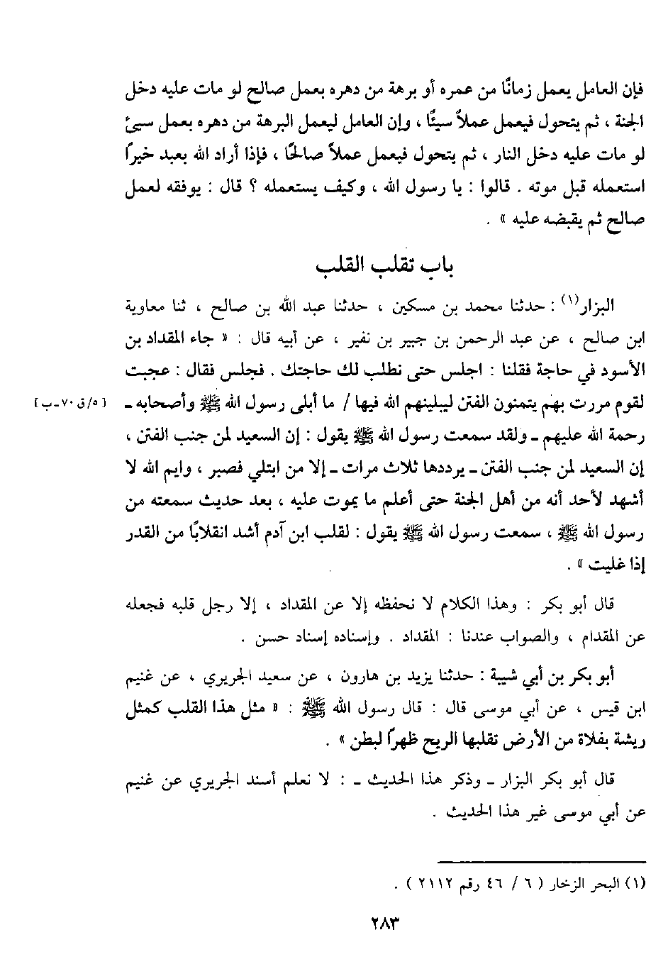 الْبَزَّار: حَدثنَا مُحَمَّد بن مِسْكين، حَدثنَا عبد الله بن صَالح، ثَنَا مُعَاوِيَة ابْن صَالح، عَن عبد الرَّحْمَن بن جُبَير بن نفير، عَن أَبِيه قَالَ: " جَاءَ الْمِقْدَاد بن الْأسود فِي حَاجَة فَقُلْنَا: اجْلِسْ حَتَّى نطلب لَك حَاجَتك. فَجَلَسَ فَقَالَ: عجبت لقوم مَرَرْت بهم يتمنون الْفِتَن ليبلينهم الله فِيهَا مَا أبلى رَسُول الله - صَلَّى اللَّهُ عَلَيْهِ وَسَلَّم َ - وَأَصْحَابه - رَحْمَة الله عَلَيْهِم - وَلَقَد سَمِعت رَسُول الله - صَلَّى اللَّهُ عَلَيْهِ وَسَلَّم َ - يَقُول: إِن السعيد لمن جنب الْفِتَن، إِن السعيد لمن جنب الْفِتَن - يُرَدِّدهَا ثَلَاث مَرَّات - إِلَّا من ابْتُلِيَ فَصَبر، وَايْم الله لَا أشهد لأحد أَنه من أهل الْجنَّة حَتَّى أعلم مَا يَمُوت عَلَيْهِ، بعد حَدِيث سمعته من رَسُول الله - صَلَّى اللَّهُ عَلَيْهِ وَسَلَّم َ -، سَمِعت رَسُول الله - صَلَّى اللَّهُ عَلَيْهِ وَسَلَّم َ - يَقُول: لقلب ابْن آدم أَشد انقلاباً من الْقدر إِذا غليت ".