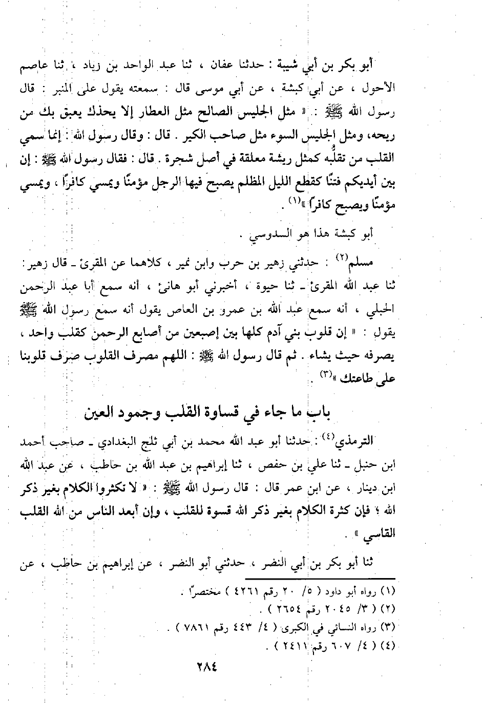 مُسلم: حَدثنِي زُهَيْر بن حَرْب وَابْن نمير، كِلَاهُمَا عَن الْمُقْرِئ - قَالَ زُهَيْر: ثَنَا عبد الله الْمُقْرِئ - ثَنَا حَيْوَة، أَخْبرنِي أَبُو هَانِئ، أَنه سمع أَبَا عبد الرَّحْمَن الحبلي، أَنه سمع عبد الله بن عَمْرو بن الْعَاصِ يَقُول أَنه سمع رَسُول الله - صَلَّى اللَّهُ عَلَيْهِ وَسَلَّم َ - يَقُول: " إِن قُلُوب بني آدم كلهَا بَين إِصْبَعَيْنِ من أَصَابِع الرَّحْمَن كقلب وَاحِد، يصرفهُ حَيْثُ يَشَاء. ثمَّ قَالَ رَسُول الله - صَلَّى اللَّهُ عَلَيْهِ وَسَلَّم َ -: اللَّهُمَّ مصرف الْقُلُوب صرف قُلُوبنَا على طَاعَتك ".