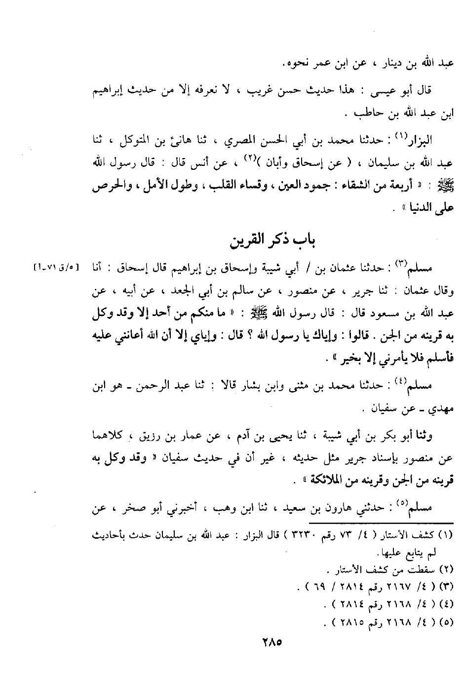 مُسلم: حَدثنَا عُثْمَان بن أبي شيبَة وَإِسْحَاق بن إِبْرَاهِيم قَالَ إِسْحَاق: أَنا وَقَالَ عُثْمَان: ثَنَا جرير، عَن مَنْصُور، عَن سَالم بن أبي الْجَعْد، عَن أَبِيه، عَن عبد الله بن مَسْعُود قَالَ: قَالَ رَسُول الله - صَلَّى اللَّهُ عَلَيْهِ وَسَلَّم َ -: " مَا مِنْكُم من أحد إِلَّا وَقد وكل بِهِ قرينه من الْجِنّ. قَالُوا: وَإِيَّاك يَا رَسُول الله؟ قَالَ: وإياي إِلَّا أَن الله أعانني عَلَيْهِ فَأسلم فَلَا يَأْمُرنِي إِلَّا بِخَير ".