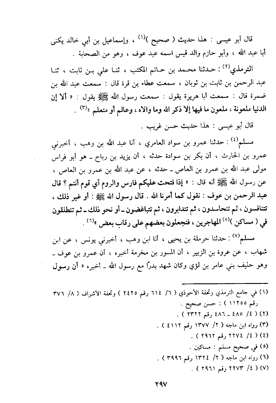مُسلم: حَدثنَا عَمْرو بن سَواد العامري، أَنا عبد الله بن وهب، أَخْبرنِي عَمْرو بن الْحَارِث، أَن بكر بن سوَادَة حَدثهُ، أَن يزِيد بن رَبَاح - هُوَ أَبُو فراس مولى عبد الله بن عَمْرو بن الْعَاصِ - حَدثهُ، عَن عبد الله بن عَمْرو بن الْعَاصِ، عَن رَسُول الله - صَلَّى اللَّهُ عَلَيْهِ وَسَلَّم َ - أَنه قَالَ: " إِذا فتحت عَلَيْكُم فَارس وَالروم أَي قوم أَنْتُم؟ قَالَ عبد الرَّحْمَن بن عَوْف: نقُول كَمَا أمرنَا الله. قَالَ رَسُول الله - صَلَّى اللَّهُ عَلَيْهِ وَسَلَّم َ -: أَو غير ذَلِك، تتنافسون، ثمَّ تتحاسدون، ثمَّ تتدابرون، ثمَّ تتباغضون - أَو نَحْو ذَلِك - ثمَّ تنطلقون فِي (مسَاكِن) الْمُهَاجِرين، فتجعلون بَعضهم على رِقَاب بعض ".