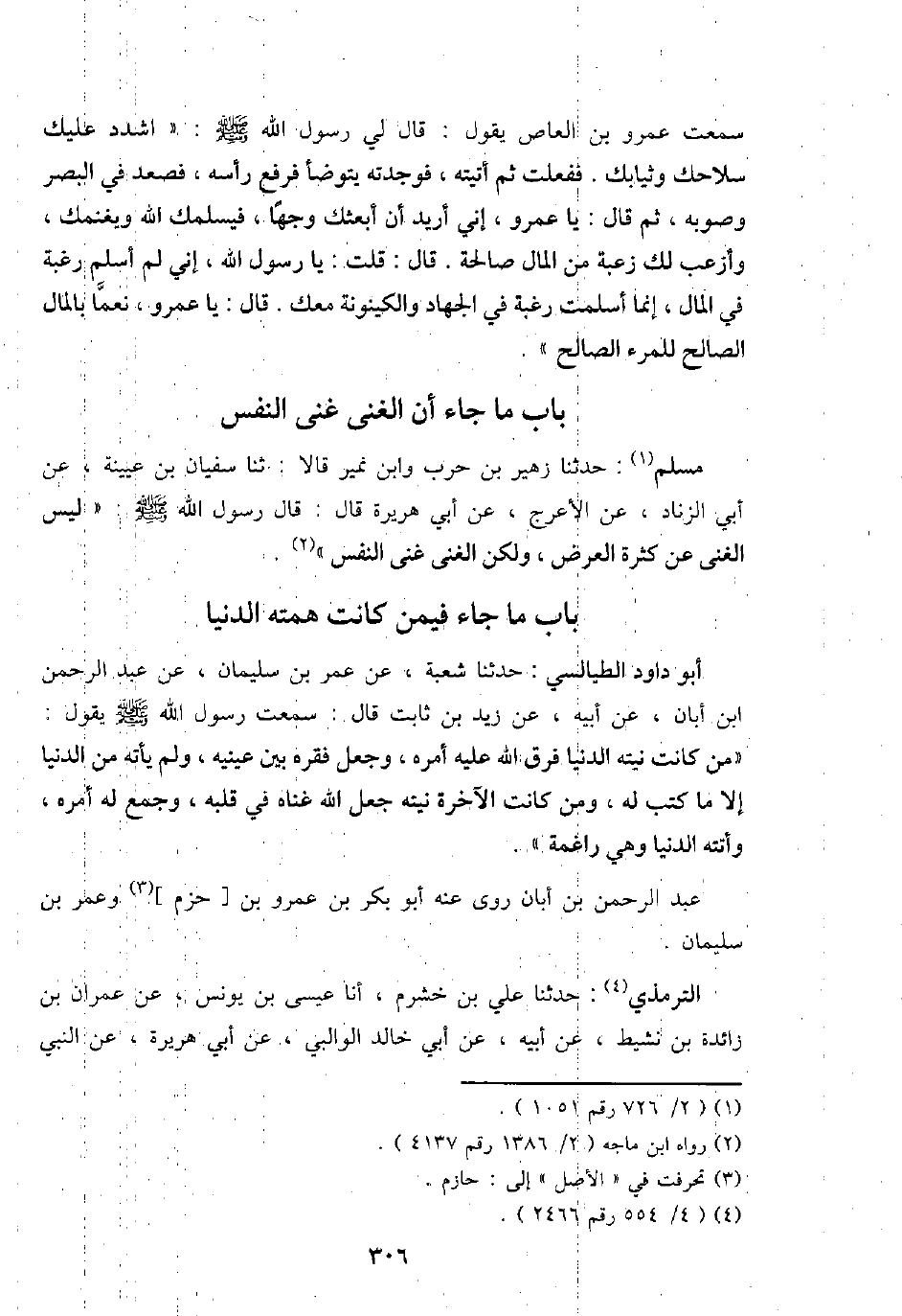 مُسلم: حَدثنَا زُهَيْر بن حَرْب وَابْن نمير قَالَا: ثَنَا سُفْيَان بن عُيَيْنَة، عَن أبي الزِّنَاد، عَن الْأَعْرَج، عَن أبي هُرَيْرَة قَالَ: قَالَ رَسُول الله - صَلَّى اللَّهُ عَلَيْهِ وَسَلَّم َ -: " لَيْسَ الْغنى عَن كَثْرَة الْعرض، وَلَكِن الْغنى غنى النَّفس ".