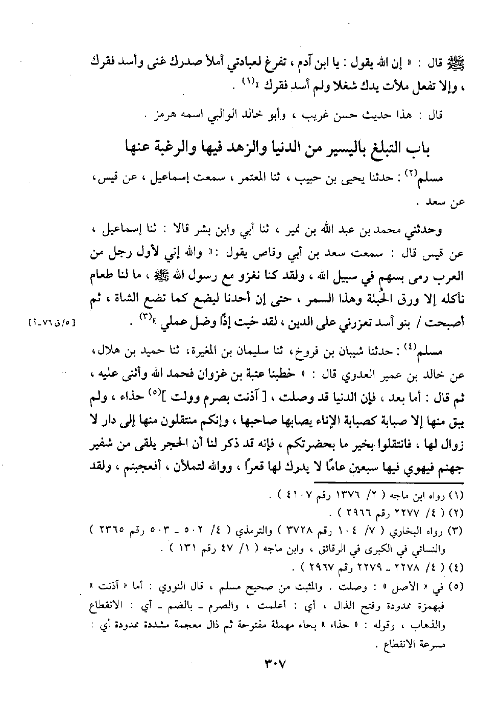 مُسلم: حَدثنَا شَيبَان بن فروخ، ثَنَا سُلَيْمَان بن الْمُغيرَة، ثَنَا حميد بن هِلَال، عَن خَالِد بن عُمَيْر الْعَدوي قَالَ: " خَطَبنَا عتبَة بن غَزوَان فَحَمدَ الله وَأثْنى عَلَيْهِ، ثمَّ قَالَ: أما بعد، فَإِن الدُّنْيَا قد وصلت، [آذَنت بِصرْم وَوَلَّتْ] حذاء، وَلم يبْق مِنْهَا إِلَّا صبَابَة كَصُبَابَةِ الْإِنَاء يصابها صَاحبهَا، وَإِنَّكُمْ منتقلون مِنْهَا إِلَى دَار لَا زَوَال لَهَا، فانتقلوا بِخَير مَا بحضرتكم، فَإِنَّهُ قد ذكر لنا أَن الْحجر يلقى من شَفير جَهَنَّم فَيهْوِي فِيهَا سبعين عَاما لَا يدْرك لَهَا قعراً، وَالله لتملأن، أفعجبتم، وَلَقَد