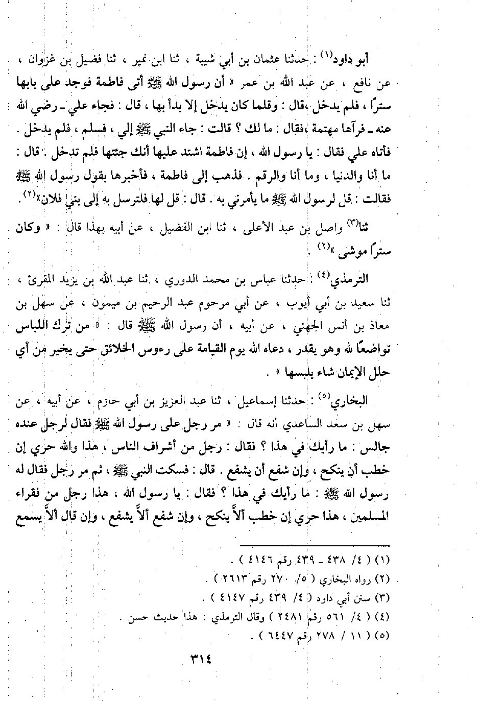 أَبُو دَاوُد: حَدثنَا عُثْمَان بن أبي شيبَة، ثَنَا ابْن نمير، ثَنَا فُضَيْل بن غَزوَان، عَن نَافِع، عَن عبد الله بن عمر " أَن رَسُول الله - صَلَّى اللَّهُ عَلَيْهِ وَسَلَّم َ - أَتَى فَاطِمَة فَوجدَ على بَابهَا سترا، فَلم يدْخل، قَالَ: وقلما كَانَ يدْخل إِلَّا بَدَأَ بهَا، قَالَ: فجَاء عَليّ - رَضِي الله عَنهُ - فرآها مهتمة، فَقَالَ: مَا لَك؟ قَالَت: جَاءَ النَّبِي - صَلَّى اللَّهُ عَلَيْهِ وَسَلَّم َ - إِلَيّ، فَسلم، فَلم يدْخل. فَأَتَاهُ عَليّ فَقَالَ: يَا رَسُول الله، إِن فَاطِمَة اشْتَدَّ عَلَيْهَا أَنَّك جِئْتهَا فَلم تدخل. قَالَ: مَا أَنا وَالدُّنْيَا، وَمَا أَنا والرقم. فَذهب إِلَى فَاطِمَة، فَأَخْبرهَا بقول رَسُول الله - صَلَّى اللَّهُ عَلَيْهِ وَسَلَّم َ - فَقَالَت: قل لرَسُول الله - صَلَّى اللَّهُ عَلَيْهِ وَسَلَّم َ - مَا يَأْمُرنِي بِهِ. قَالَ: قل لَهَا فلترسل بِهِ إِلَى بني فلَان ".