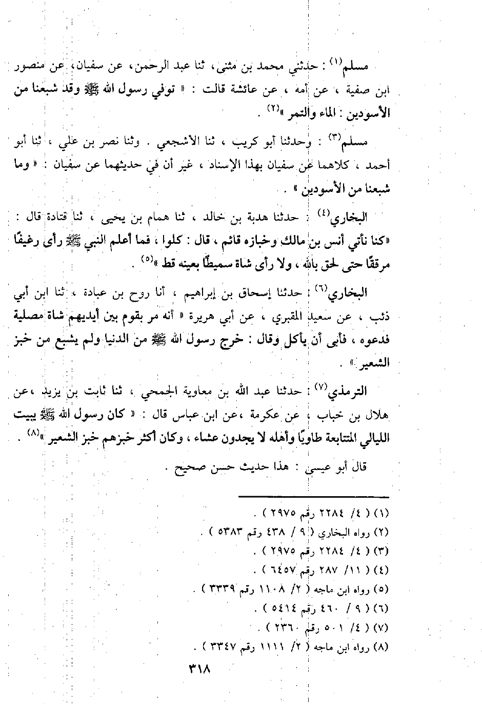 البُخَارِيّ: حَدثنَا إِسْحَاق بن إِبْرَاهِيم، أَنا روح بن عبَادَة، ثَنَا ابْن أبي ذِئْب، عَن سعيد المَقْبُري، عَن أبي هُرَيْرَة " أَنه مر بِقوم بَين أَيْديهم شَاة مصلية فَدَعوهُ، فَأبى أَن يَأْكُل وَقَالَ: خرج رَسُول الله - صَلَّى اللَّهُ عَلَيْهِ وَسَلَّم َ - من الدُّنْيَا وَلم يشْبع من خبز الشّعير ".