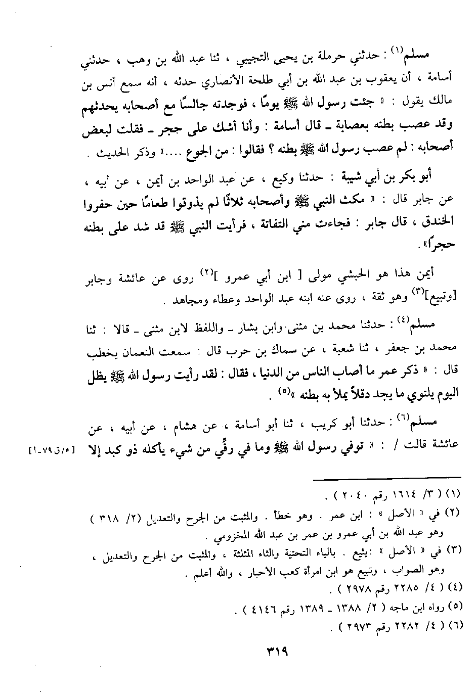 مُسلم: حَدثنِي حَرْمَلَة بن يحيى التجِيبِي، ثَنَا عبد الله بن وهب، حَدثنِي أُسَامَة، أَن يَعْقُوب بن عبد الله بن أبي طَلْحَة الْأنْصَارِيّ حَدثهُ، أَنه سمع أنس بن مَالك يَقُول: " جِئْت رَسُول الله - صَلَّى اللَّهُ عَلَيْهِ وَسَلَّم َ - يَوْمًا، فَوَجَدته جَالِسا مَعَ أَصْحَابه يُحَدِّثهُمْ وَقد عصب بَطْنه بعصابة - قَالَ أُسَامَة: وَأَنا أَشك على حجر - فَقلت لبَعض أَصْحَابه: لم عصب رَسُول الله - صَلَّى اللَّهُ عَلَيْهِ وَسَلَّم َ - بَطْنه؟ فَقَالُوا: من الْجُوع ... " وَذكر الحَدِيث.