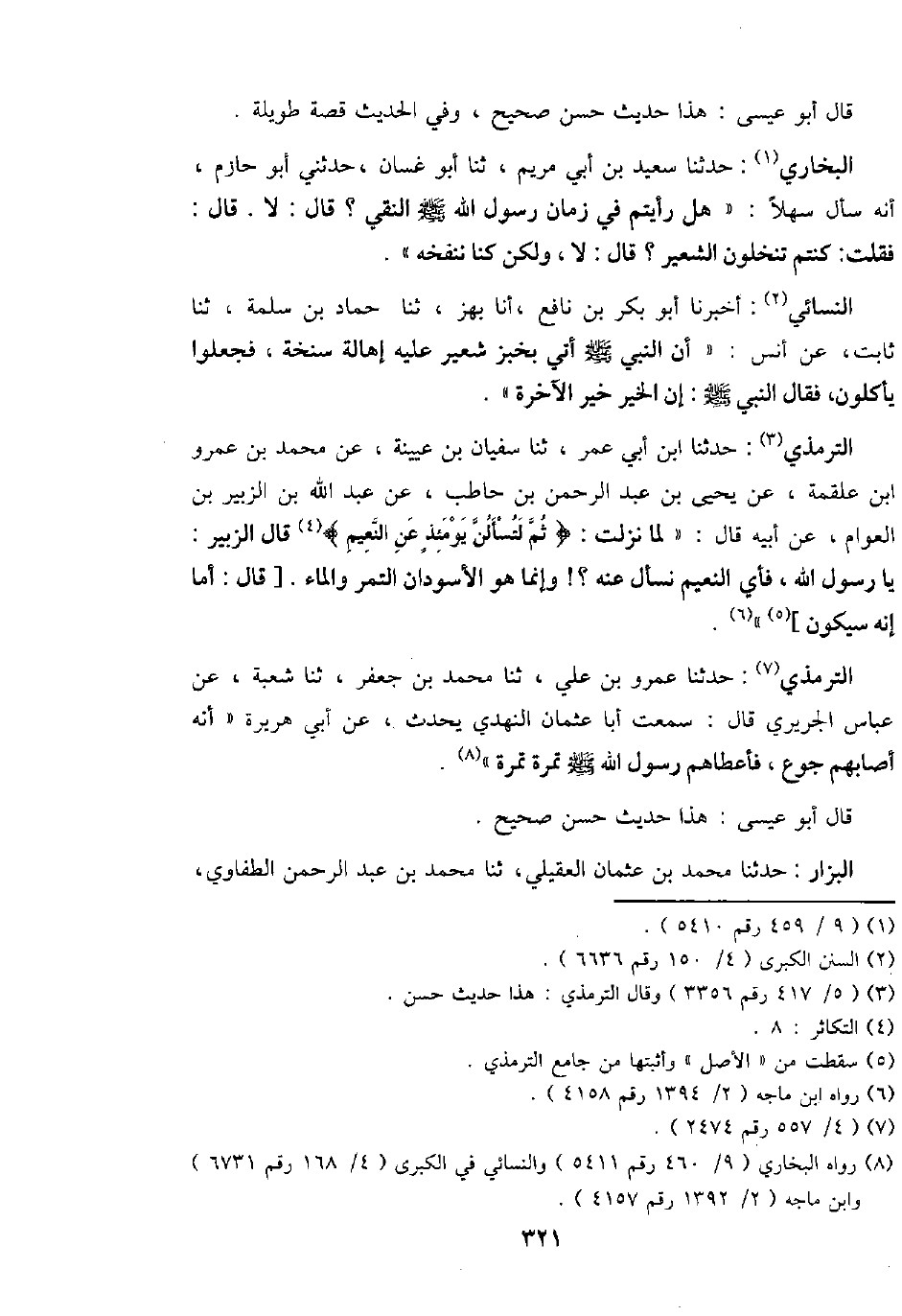 التِّرْمِذِيّ: حَدثنَا ابْن أبي عمر، ثَنَا سُفْيَان بن عُيَيْنَة، عَن مُحَمَّد بن عَمْرو ابْن عَلْقَمَة، عَن يحيى بن عبد الرَّحْمَن بن حَاطِب، عَن عبد الله بن الزبير بن الْعَوام، عَن أَبِيه قَالَ: " لما نزلت: {ثمَّ لتسألن يَوْمئِذٍ عَن النَّعيم} قَالَ الزبير: يَا رَسُول الله، فَأَي النَّعيم نسْأَل عَنهُ؟ ! وَإِنَّمَا هُوَ الأسودان التَّمْر وَالْمَاء. [قَالَ: أما إِنَّه سَيكون] ".