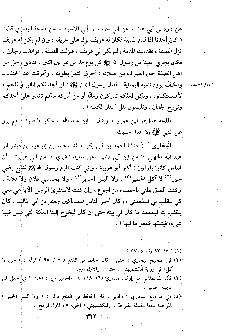 عَن دَاوُد بن أبي هِنْد، عَن أبي حَرْب بن أبي الْأسود، عَن طَلْحَة الْبَصْرِيّ قَالَ: " كَانَ أَحَدنَا إِذا قدم الْمَدِينَة فَكَانَ لَهُ عريف نزل على عريفة، وَإِن لم يكن لَهُ عريف نزل الصّفة، فَقدمت الْمَدِينَة وَلم يكن لي عريف، فَنزلت الصّفة، فَوَافَقت رجلَيْنِ، فَكَانَ يجْرِي علينا من رَسُول الله - صَلَّى اللَّهُ عَلَيْهِ وَسَلَّم َ - كل يَوْم مد من تمر بَين اثْنَيْنِ، فَنَادَى رجل من أهل الصّفة حِين انْصَرف من صلَاته: أحرق التَّمْر بطوننا، وتحرقت عَنَّا الخنف - والخنف برود تشبه اليمانية - فَقَالَ رَسُول الله - صَلَّى اللَّهُ عَلَيْهِ وَسَلَّم َ -: لَو أجد لكم الْخبز وَاللَّحم، لأطعمتكموه، وَلَكِن لَعَلَّكُمْ تدركون زَمَانا أَو من أدْركهُ مِنْكُم تَغْدُو على أحدكُم وَتَروح الجفان، وتلبسون مثل أَسْتَار الْكَعْبَة ".