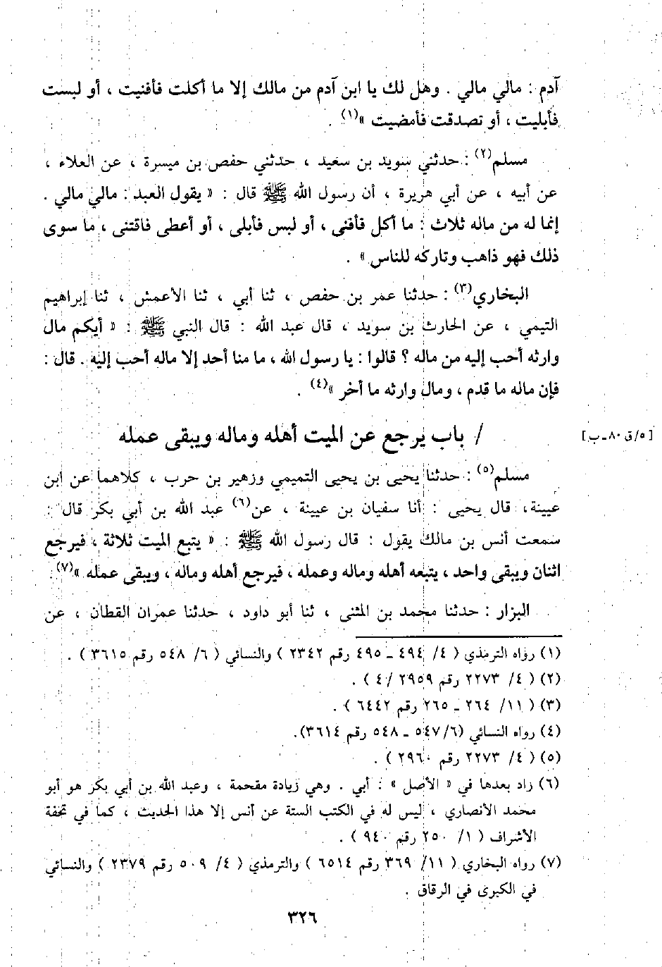 مُسلم: حَدثنِي سُوَيْد بن سعيد، حَدثنِي حَفْص بن ميسرَة، عَن الْعَلَاء، عَن أَبِيه، عَن أبي هُرَيْرَة، أَن رَسُول الله - صَلَّى اللَّهُ عَلَيْهِ وَسَلَّم َ - قَالَ: " يَقُول العَبْد: مَالِي مَالِي. إِنَّمَا لَهُ من مَاله ثَلَاث: مَا أكل فأفنى، أَو لبس فأبلى، أَو أعْطى فاقتنى، مَا سوى ذَلِك فَهُوَ ذَاهِب وتاركه للنَّاس "