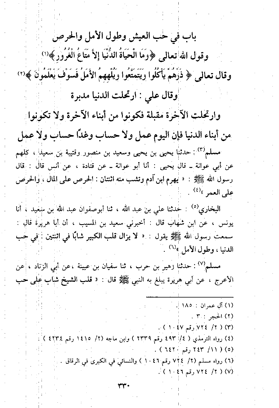 مُسلم: حَدثنَا يحيى بن يحيى وَسَعِيد بن مَنْصُور وقتيبة بن سعيد، كلهم عَن أبي عوَانَة - قَالَ يحيى: أَنا أَبُو عوَانَة - عَن قَتَادَة عَن أنس قَالَ: قَالَ رَسُول الله - صَلَّى اللَّهُ عَلَيْهِ وَسَلَّم َ -: " يهرم ابْن آدم وتشب مِنْهُ اثْنَتَانِ: الْحِرْص على المَال، والحرص على الْعُمر ".