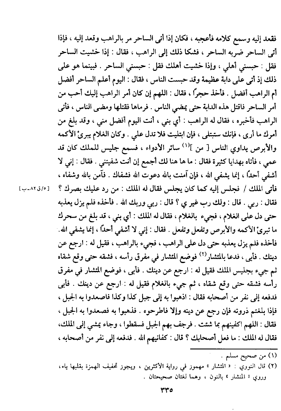فَقعدَ إِلَيْهِ وَسمع كَلَامه فأعجبه، فَكَانَ إِذا أَتَى السَّاحر مر بِالرَّاهِبِ وَقعد إِلَيْهِ، فَإِذا أَتَى السَّاحر ضربه السَّاحر، فَشَكا ذَلِك إِلَى الراهب، فَقَالَ: إِذا خشيت السَّاحر فَقل: حَبَسَنِي أَهلِي، وَإِذا خشيت أهلك فَقل: حَبَسَنِي السَّاحر: فَبَيْنَمَا هُوَ على ذَلِك إِذْ أَتَى على دَابَّة عَظِيمَة وَقد حبست النَّاس، فَقَالَ: الْيَوْم أعلم السَّاحر أفضل أم الراهب أفضل. فَأخذ جحراً، فَقَالَ: اللَّهُمَّ إِن كَانَ أَمر الراهب إِلَيْك أحب من أَمر السَّاحر فَاقْتُلْ هَذِه الدَّابَّة حَتَّى يمْضِي النَّاس. فَرَمَاهَا فَقَتلهَا وَمضى النَّاس، فَأتى الراهب فَأخْبرهُ فَقَالَ لَهُ الراهب: أَي بني، أَنْت الْيَوْم أفضل مني، وَقد بلغ من أَمرك مَا أرى، فَإنَّك ستبتلى، فَإِن ابْتليت فَلَا تدل عَليّ. وَكَانَ الْغُلَام يُبرئ الأكمه والأبرص يداوي النَّاس [من] سَائِر الأدواء، فَسمع جليس للْملك كَانَ قد عمي، فَأَتَاهُ بهداياه كَثِيرَة فَقَالَ: مَا هَا هُنَا لَك أجمع إِن أَنْت شفيتني. فَقَالَ: إِنِّي لَا أشفي أحدا، إِنَّمَا يشفي الله، فَإِن آمَنت بِاللَّه دَعَوْت الله فشفاك. فَآمن بِاللَّه وشفاه، فَأتى الْملك فَجَلَسَ إِلَيْهِ كَمَا كَانَ يجلس فَقَالَ لَهُ الْملك: من رد عَلَيْك بَصرك؟ فَقَالَ: رَبِّي. قَالَ: وَلَك رب غَيْرِي؟ قَالَ: رَبِّي وَرَبك الله. فَأَخذه فَلم يزل يعذبه حَتَّى دلّ على الْغُلَام، فجيء بالغلام، فَقَالَ لَهُ الْملك: أَي بني، قد بلغ من سحرك مَا تبرئ الأكمه والأبرص وَتفعل وَتفعل. فَقَالَ: إِنِّي لَا أشفي أحدا، إِنَّمَا يشفي الله. فاخذه فَلم يزل يعذبه حَتَّى دلّ على الراهب، فجيء بِالرَّاهِبِ، فَقيل لَهُ: ارْجع عَن دينك. فَأبى، فَدَعَا بالمئشار فَوضع المئشار فِي مفرق رَأسه، فشقه حَتَّى وَقع شقاه ثمَّ جِيءَ بجليس الْملك فَقيل لَهُ: ارْجع عَن دينك. فَأبى، فَوضع المئشار فِي مفرق رَأسه فشقه حَتَّى وَقع شقاه، ثمَّ جِيءَ بالغلام فَقيل لَهُ: ارْجع عَن دينك. فَأبى فَدفعهُ إِلَى نفر من أَصْحَابه فَقَالَ: اذْهَبُوا بِهِ إِلَى جبل كَذَا وَكَذَا فاصعدوا بِهِ الْجَبَل، فَإِذا بَلغْتُمْ ذروته فَإِن رَجَعَ عَن دينه وَإِلَّا فاطرحوه. فَذَهَبُوا بِهِ فَصَعِدُوا بِهِ الْجَبَل، فَقَالَ: اللَّهُمَّ اكفينهم بِمَا شِئْت. فَرَجَفَ بهم الْجَبَل فسقطوا، وَجَاء يمشي إِلَى الْملك، فَقَالَ لَهُ الْملك: مَا فعل أَصْحَابك؟ قَالَ: كفانيهم الله. فَدفعهُ إِلَى نفر من أَصْحَابه،