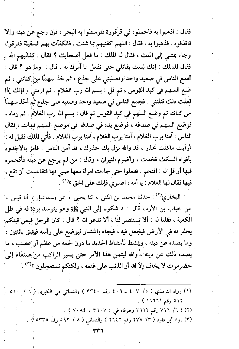 فَقَالَ: اذْهَبُوا بِهِ فاحملوه فِي قرقورة فتوسطوا بِهِ الْبَحْر، فَإِن رَجَعَ عَن دينه وَإِلَّا فاقذفوه. فَذَهَبُوا بِهِ، فَقَالَ: اللَّهُمَّ اكفنيهم بِمَا شِئْت. فَانْكَفَأت بهم السَّفِينَة فَغَرقُوا، وَجَاء يمشي إِلَى الْملك، فَقَالَ لَهُ الْملك: مَا فعل أَصْحَابك؟ فَقَالَ: كفانيهم الله. فَقَالَ للْملك: إِنَّك لست بِقَاتِلِي حَتَّى تفعل مَا آمُرك بِهِ. قَالَ: وَمَا هُوَ؟ قَالَ: تجمع النَّاس فِي صَعِيد وَاحِد وَتَصْلُبنِي على جذع، ثمَّ خُذ سَهْما من كِنَانَتِي، ثمَّ ضع السهْم فِي كبد الْقوس، ثمَّ قل: بِسم الله رب الْغُلَام. ثمَّ ارمني، فَإنَّك إِذا فعلت ذَلِك قتلتني. فَجمع النَّاس فِي صَعِيد وَاحِد وصلبه على جذع ثمَّ أَخذ سَهْما من كِنَانَته ثمَّ وضع السهْم فِي كبد الْقوس ثمَّ قَالَ: بِسم الله رب الْغُلَام. ثمَّ رَمَاه، فَوضع السهْم فِي صُدْغه، فَوضع يَده فِي صُدْغه فِي مَوضِع السهْم فَمَاتَ، فَقَالَ النَّاس: آمنا بِرَبّ الْغُلَام، آمنا بِرَبّ الْغُلَام، آمنا بِرَبّ الْغُلَام. فَأتى الْملك فَقيل لَهُ: أَرَأَيْت مَا كنت تحذر، قد وَالله نزل بك حذرك، قد آمن النَّاس. فَأمر بِالْأُخْدُودِ بأفواه السكَك فخدت. وأضرم النيرَان، وَقَالَ: من لم يرجع عَن دينه فأقحموه فِيهَا أَو قل لَهُ: اقتحم فَفَعَلُوا حَتَّى جَاءَت امْرَأَة مَعهَا صبي لَهَا فَتَقَاعَسَتْ أَن تقع، فِيهَا فَقَالَ لَهَا الْغُلَام: يَا أمه، اصْبِرِي فَإنَّك على الْحق ".