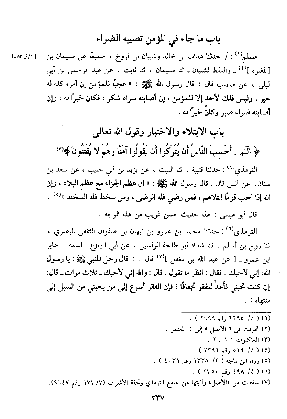 مُسلم: حَدثنَا هداب بن خَالِد وشيبان بن فروخ، جَمِيعًا عَن سُلَيْمَان بن [الْمُغيرَة]- وَاللَّفْظ لشيبان - ثَنَا سُلَيْمَان، ثَنَا ثَابت، عَن عبد الرَّحْمَن بن أبي ليلى، عَن صُهَيْب قَالَ: قَالَ رَسُول الله - صَلَّى اللَّهُ عَلَيْهِ وَسَلَّم َ -: " عجبا لِلْمُؤمنِ إِن أمره كُله لَهُ خير، وَلَيْسَ ذَلِك لأحد إِلَّا لِلْمُؤمنِ، إِن أَصَابَته سراء شكر، فَكَانَ خيرا لَهُ، وَإِن أَصَابَته ضراء صَبر وَكَانَ خيرا لَهُ ".