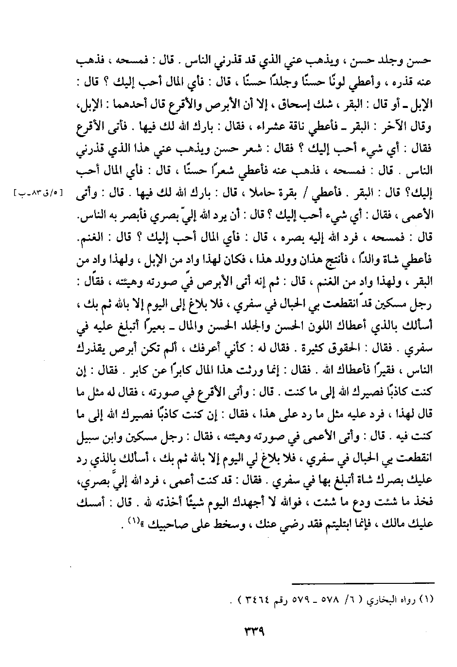 حسن وَجلده حسن، وَيذْهب عني الَّذِي قد قذرني النَّاس. قَالَ: فمسحه، فَذهب عَنهُ قذره، وَأعْطِي لوناً حسنا وجلداً حسنا، قَالَ: فَأَي المَال أحب إِلَيْك؟ قَالَ: الْإِبِل - أَو قَالَ الْبَقر، شكّ إِسْحَاق، إِلَّا أَن الأبرص والأقرع قَالَ أَحدهمَا: الْإِبِل، وَقَالَ الآخر: الْبَقر - فَأعْطِي نَاقَة عشراء، فَقَالَ: بَارك الله لَك فِيهَا. فَأتى الْأَقْرَع فَقَالَ: أَي شَيْء أحب إِلَيْك؟ فَقَالَ: شعر حسن وَيذْهب عني هَذَا الَّذِي قذرني النَّاس. قَالَ: فمسحه، فَذهب عَنهُ فَأعْطِي شعرًا حسنا، قَالَ: فَأَي المَال أحب إِلَيْك؟ قَالَ: الْبَقر. فَأعْطِي بقرة حَامِلا، قَالَ: بَارك الله لَك فِيهَا. قَالَ: وأتى الْأَعْمَى، فَقَالَ: أَي شَيْء أحب إِلَيْك؟ قَالَ: أَن يرد الله إِلَيّ بَصرِي فأبصر بِهِ النَّاس. قَالَ: فمسحه، فَرد الله إِلَيْهِ بَصَره، قَالَ: فَأَي المَال أحب إِلَيْك؟ قَالَ: الْغنم. فَأعْطِي شَاة والداً، فأنتج هَذَانِ وَولد هَذَا، فَكَانَ لهَذَا وَاد من الْإِبِل، وَلِهَذَا وَاد من الْبَقر، وَلِهَذَا وَاد من الْغنم، قَالَ: ثمَّ إِنَّه أَتَى الأبرص فِي صورته وهيئته، فَقَالَ: رجل مِسْكين قد انْقَطَعت بِي الحبال فِي سَفَرِي، فَلَا بَلَاغ إِلَى الْيَوْم إِلَّا بِاللَّه ثمَّ بك، أَسأَلك بِالَّذِي أَعْطَاك اللَّوْن الْحسن وَالْجَلد الْحسن وَالْمَال - بَعِيرًا أتبلغ عَلَيْهِ فِي سَفَرِي. فَقَالَ: الْحُقُوق كَثِيرَة. فَقَالَ لَهُ: كَأَنِّي أعرفك، ألم تكن أبرص يقذرك النَّاس، فَقِيرا فأعطاك الله. فَقَالَ: إِنَّمَا ورثت هَذَا المَال كَابِرًا عَن كَابر. فَقَالَ: إِن كنت كَاذِبًا فصيرك الله إِلَى مَا كنت. قَالَ: وأتى الْأَقْرَع فِي صورته، فَقَالَ لَهُ مثل مَا قَالَ لهَذَا، فَرد عَلَيْهِ مثل مَا رد على هَذَا، فَقَالَ: إِن كنت كَاذِبًا فصيرك الله إِلَى مَا كنت فِيهِ. قَالَ: وأتى الْأَعْمَى فِي صورته وهيئته، فَقَالَ: رجل مِسْكين وَابْن سَبِيل انْقَطَعت بِي الحبال فِي سَفَرِي، فَلَا بَلَاغ لي الْيَوْم إِلَّا بِاللَّه ثمَّ بك، أَسأَلك بِالَّذِي رد عَلَيْك بَصرك شَاة أتبلغ بهَا فِي سَفَرِي. فَقَالَ: قد كنت أعمى، فَرد الله إِلَيّ بَصرِي، فَخذ مَا شِئْت ودع مَا شِئْت، فوَاللَّه لَا أجهدك الْيَوْم شَيْئا أَخَذته لله. قَالَ: أمسك عَلَيْك مَالك، فَإِنَّمَا ابتليتم فقد رَضِي عَنْك، وَسخط على صاحبيك ".