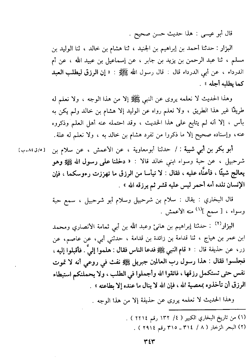 الْبَزَّار: حَدثنَا إِبْرَاهِيم بن هَانِئ وَعبد الله بن أبي ثُمَامَة الْأنْصَارِيّ وَمُحَمّد ابْن عمر بن هياج، ثَنَا قدامَة بن زَائِدَة بن قدامَة، حَدثنِي أبي، عَن عَاصِم، عَن زر، عَن حُذَيْفَة قَالَ: " قَامَ النَّبِي - صَلَّى اللَّهُ عَلَيْهِ وَسَلَّم َ - فَدَعَا النَّاس فَقَالَ: هلموا إِلَيّ. فاقبلوا إِلَيْهِ. فجلسوا فَقَالَ: هَذَا رَسُول رب الْعَالمين جِبْرِيل - صَلَّى اللَّهُ عَلَيْهِ وَسَلَّم َ - نفث فِي روعي أَنه لَا تَمُوت نفس حَتَّى تستكمل رزقها، فَاتَّقُوا الله وأجملوا فِي الطّلب، وَلَا يحملنكم استبطاء الرزق أَن تأخذوه بِمَعْصِيَة الله، فَإِن الله لَا ينَال مَا عِنْده إِلَّا بِطَاعَتِهِ ".