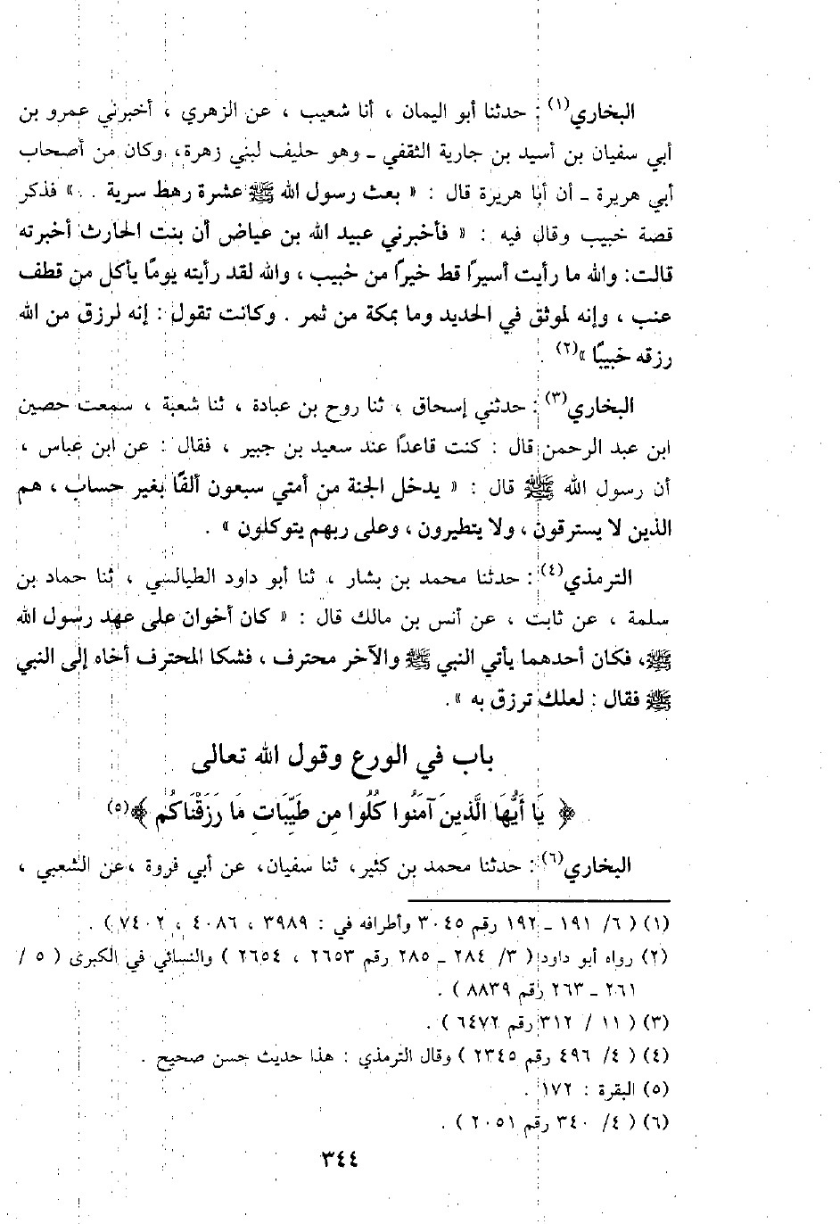 البُخَارِيّ: حَدثنِي إِسْحَاق، ثَنَا روح بن عبَادَة، ثَنَا شُعْبَة، سَمِعت حُصَيْن ابْن عبد الرَّحْمَن قَالَ: كنت قَاعِدا عِنْد سعيد بن جُبَير، فَقَالَ: عَن ابْن عَبَّاس، أَن رَسُول الله - صَلَّى اللَّهُ عَلَيْهِ وَسَلَّم َ - قَالَ: " يدْخل الْجنَّة من أمتِي سَبْعُونَ ألفا بِغَيْر حِسَاب، هم الَّذين لَا يسْتَرقونَ، وَلَا يَتَطَيَّرُونَ، وعَلى رَبهم يَتَوَكَّلُونَ ".