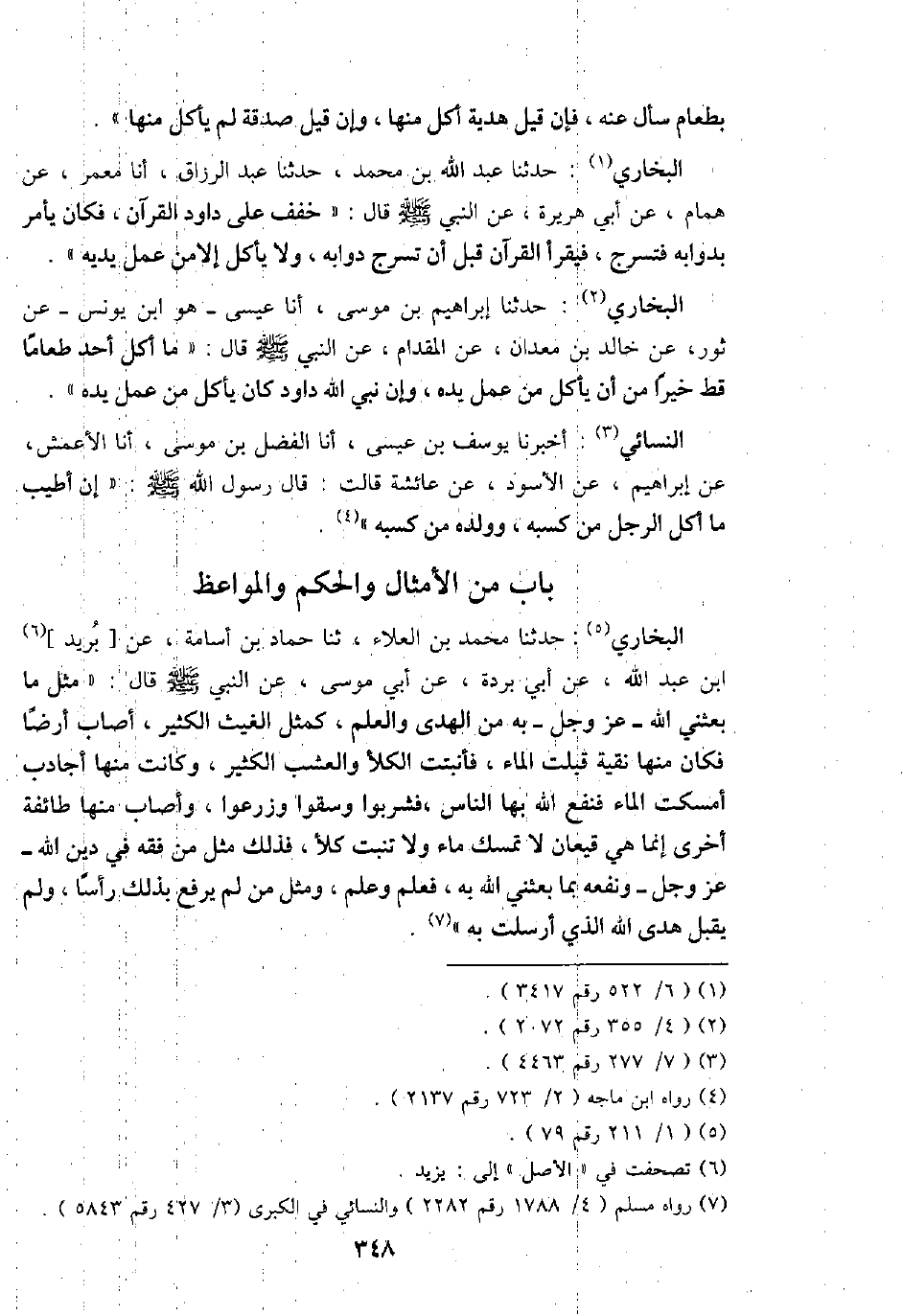 البُخَارِيّ: حَدثنَا إِبْرَاهِيم بن مُوسَى، أَنا عِيسَى - هُوَ ابْن يُونُس - عَن ثَوْر، عَن خَالِد بن معدان، عَن الْمِقْدَام، عَن النَّبِي - صَلَّى اللَّهُ عَلَيْهِ وَسَلَّم َ - قَالَ: " مَا أكل أحد طَعَاما قطّ خيرا من أَن يَأْكُل من عمل يَده، وَإِن نَبِي الله دَاوُد كَانَ يَأْكُل من عمل يَده ".