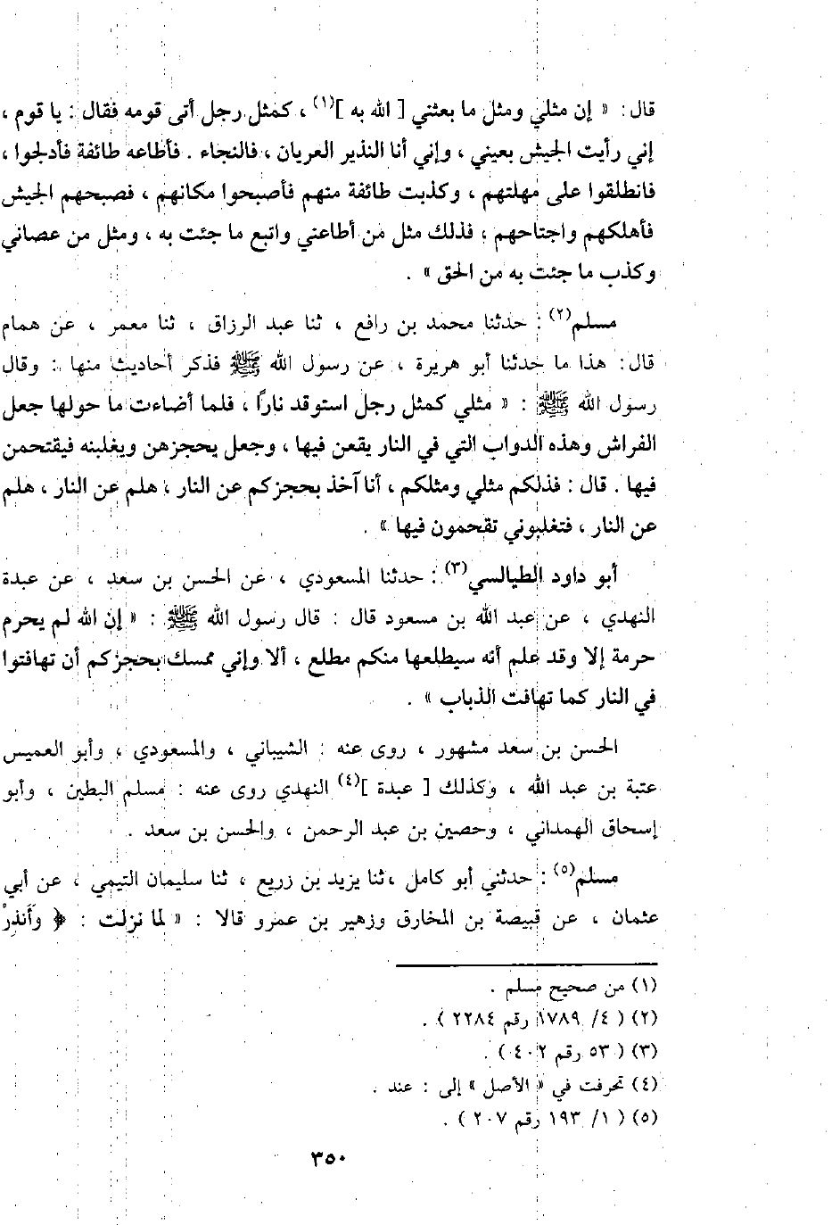 مُسلم: حَدثنَا مُحَمَّد بن رَافع، ثَنَا عبد الرَّزَّاق، ثَنَا معمر، عَن همام قَالَ: وَهَذَا مَا حَدثنَا أَبُو هُرَيْرَة، عَن رَسُول الله - صَلَّى اللَّهُ عَلَيْهِ وَسَلَّم َ - فَذكر أَحَادِيث مِنْهَا: وَقَالَ رَسُول الله - صَلَّى اللَّهُ عَلَيْهِ وَسَلَّم َ -: " مثلي كَمثل رجل استوقد نَارا، فَلَمَّا أَضَاءَت مَا حولهَا جعل الْفراش وَهَذِه الدَّوَابّ الَّتِي فِي النَّار يقعن فِيهَا، وَجعل بحجزهن ويغلبنه فيقتحمن فِيهَا. قَالَ: فذلكم مثلي ومثلكم، أَنا آخذ بِحُجزِكُمْ عَن النَّار، هَلُمَّ عَن النَّار، هَلُمَّ عَن النَّار، فتغلبوني تقتحمون فِيهَا ".