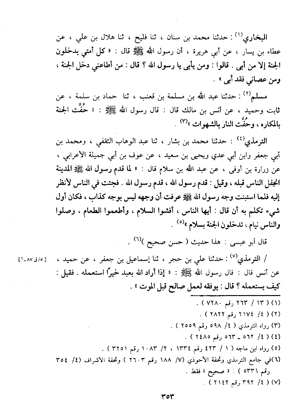 مُسلم: حَدثنَا عبد الله بن مسلمة بن قعنب، ثَنَا حَمَّاد بن سَلمَة، عَن ثَابت وَحميد، عَن أنس بن مَالك قَالَ: قَالَ رَسُول الله - صَلَّى اللَّهُ عَلَيْهِ وَسَلَّم َ -: " حفت الْجنَّة بالمكارة، وحفت النَّار بالشهوات ".