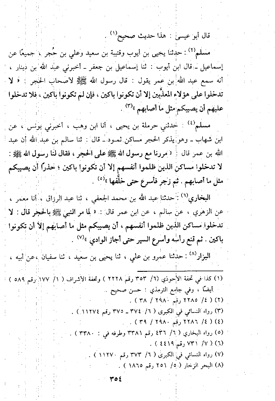 مُسلم: حَدثنَا يحيى بن أَيُّوب وقتيبة بن سعيد وَعلي بن حجر، جَمِيعًا عَن إِسْمَاعِيل - قَالَ ابْن أَيُّوب: ثَنَا إِسْمَاعِيل بن جَعْفَر - أَخْبرنِي عبد الله بن دِينَار، أَنه سمع عبد الله بن عمر يَقُول: قَالَ رَسُول الله - صَلَّى اللَّهُ عَلَيْهِ وَسَلَّم َ - لأَصْحَاب الْحجر: " لَا تدْخلُوا على هَؤُلَاءِ الْمُعَذَّبين إِلَّا أَن تَكُونُوا بَاكِينَ، فَإِن لم تَكُونُوا بَاكِينَ، فَلَا تدْخلُوا عَلَيْهِم أَن يُصِيبكُم مثل مَا أَصَابَهُم ".