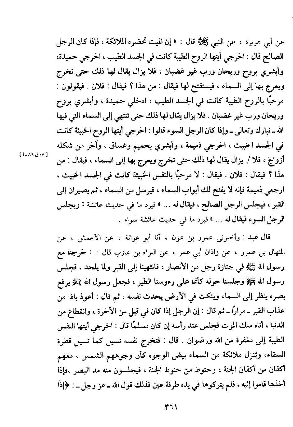 عَن أبي هُرَيْرَة، عَن النَّبِي - صَلَّى اللَّهُ عَلَيْهِ وَسَلَّم َ - قَالَ: " إِن الْمَيِّت تحضره الْمَلَائِكَة، فَإِذا كَانَ الرجل الصَّالح قَالَ: اخْرُجِي أيتها الرّوح الطّيبَة كَانَت فِي الْجَسَد الطّيب، أَخْرِجِي حميدة، وَأَبْشِرِي بِروح وَرَيْحَان وَرب غير غَضْبَان، فَلَا يزَال يُقَال لَهَا ذَلِك حَتَّى تخرج ويعرج بهَا إِلَى السَّمَاء، فيستفتح لَهَا فَيُقَال: من هَذَا؟ فَيُقَال: فلَان. فَيَقُولُونَ: مرْحَبًا بِالروحِ الطّيبَة كَانَت فِي الْجَسَد الطّيب، ادخلي حميدة، وَأَبْشِرِي بِروح وَرَيْحَان وَرب غير غَضْبَان. فَلَا يزَال يُقَال لَهَا ذَلِك حَتَّى تَنْتَهِي إِلَى السَّمَاء الَّتِي فِيهَا الله - تبَارك وَتَعَالَى - وَإِذا كَانَ الرجل السوء قَالُوا: اخْرُجِي أيتها الرّوح الخبيثة كَانَت فِي الْجَسَد الْخَبيث، اخْرُجِي ذميمة، وَأَبْشِرِي بحميم وغساق، وَآخر من شكله أَزوَاج، فَلَا يزَال يُقَال لَهَا ذَلِك حَتَّى تخرج ويعرج بهَا إِلَى السَّمَاء، فَيُقَال: من هَذَا؟ فَيُقَال: فلَان. فَيُقَال: لَا مرْحَبًا بِالنَّفسِ الخبيثة كَانَت فِي الْجَسَد الْخَبيث، ارجعي ذميمة فَإِنَّهُ لَا يفتح لَك أَبْوَاب السَّمَاء، فَيُرْسل من السَّمَاء، ثمَّ يصيران إِلَى الْقَبْر، فيجلس الرجل الصَّالح، فَيُقَال لَهُ ... . " فَيرد مَا فِي حَدِيث عَائِشَة " وَيجْلس الرجل السوء فَيُقَال لَهُ ... . " فَيرد مَا فِي حَدِيث عَائِشَة سَوَاء.