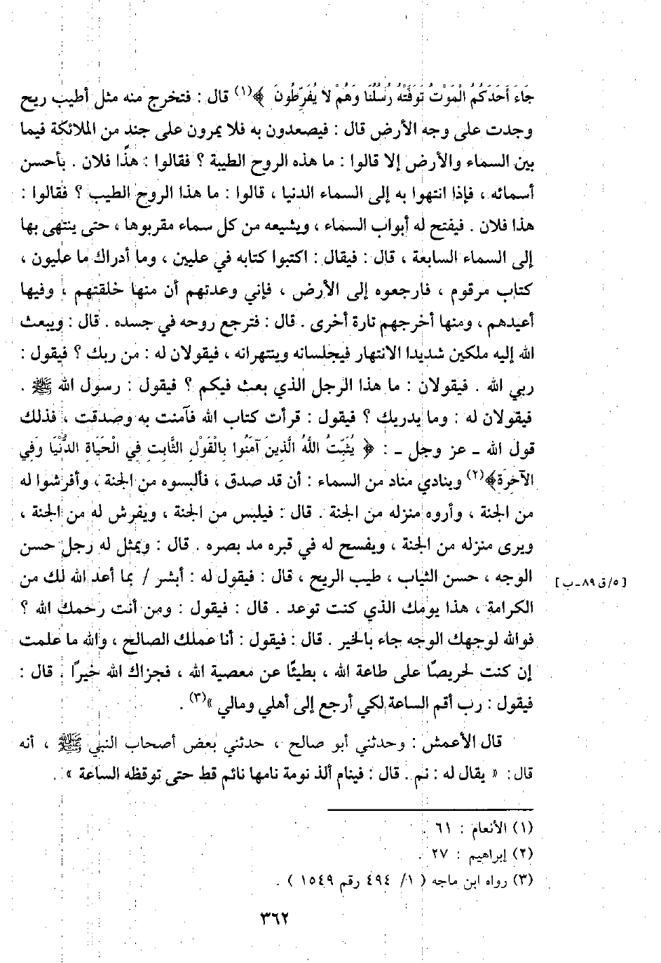 قَالَ الْأَعْمَش: وحَدثني أَبُو صَالح، حَدثنِي بعض أَصْحَاب النَّبِي - صَلَّى اللَّهُ عَلَيْهِ وَسَلَّم َ -، أَنه قَالَ: " يُقَال لَهُ: نم. قَالَ: فينام ألذ نومَة نامها نَائِم قطّ حَتَّى توقظه السَّاعَة ".