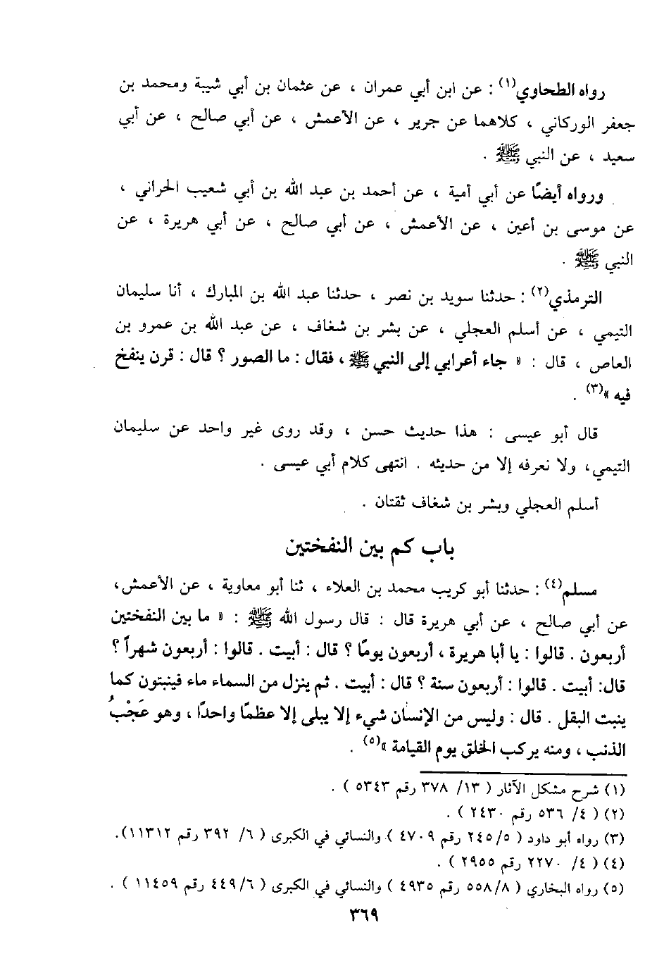 التِّرْمِذِيّ: حَدثنَا سُوَيْد بن نصر، حَدثنَا عبد الله بن الْمُبَارك، أَنا سُلَيْمَان التَّيْمِيّ، عَن أسلم الْعجلِيّ، عَن بشر بن شغَاف، عَن عبد الله بن عَمْرو بن الْعَاصِ، قَالَ: " جَاءَ أَعْرَابِي إِلَى النَّبِي - صَلَّى اللَّهُ عَلَيْهِ وَسَلَّم َ -، فَقَالَ: مَا الصُّور؟ قَالَ: قرن ينْفخ فِيهِ ".