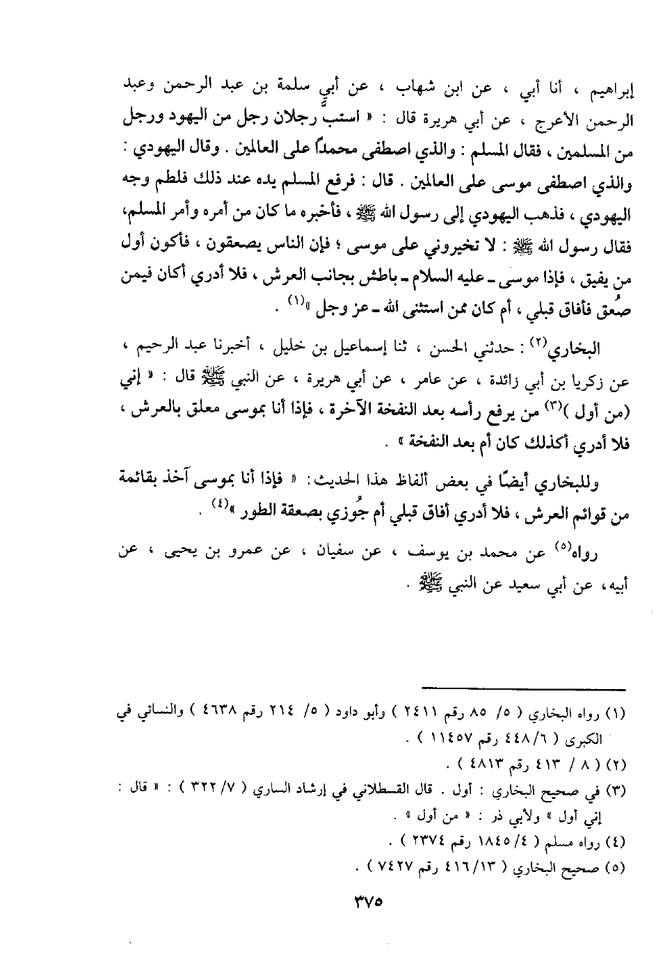 البُخَارِيّ: حَدثنِي الْحسن، ثَنَا إِسْمَاعِيل بن خَلِيل، أخبرنَا عبد الرَّحِيم، عَن زَكَرِيَّا بن أبي زَائِدَة، عَن عَامر، عَن أبي هُرَيْرَة، عَن النَّبِي - صَلَّى اللَّهُ عَلَيْهِ وَسَلَّم َ - قَالَ: " إِنِّي (من أول) من يرفع رَأسه بعد النفخة الْآخِرَة، فَإِذا أَنا بمُوسَى مُعَلّق بالعرش، فَلَا أَدْرِي أَكَذَلِك كَانَ أم بعد النفخة ".