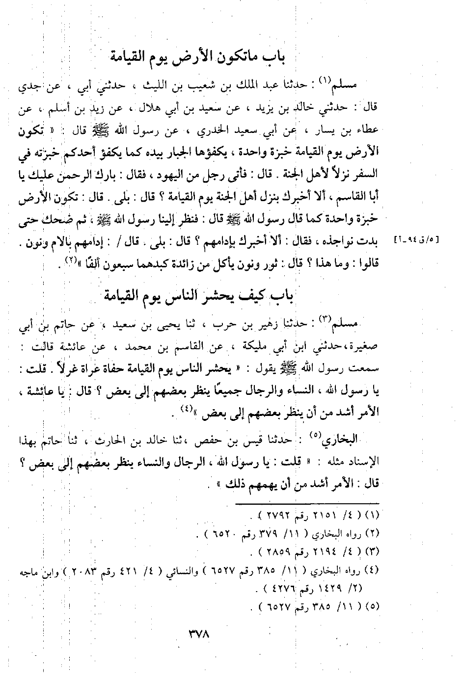 مُسلم: حَدثنَا عبد الْملك بن شُعَيْب بن اللَّيْث، حَدثنِي أبي، عَن جدي قَالَ: حَدثنِي خَالِد بن يزِيد، عَن سعيد بن أبي هِلَال، عَن زيد بن أسلم، عَن عَطاء بن يسَار، عَن أبي سعيد الْخُدْرِيّ، عَن رَسُول الله - صَلَّى اللَّهُ عَلَيْهِ وَسَلَّم َ - قَالَ: " تكون الأَرْض يَوْم الْقِيَامَة خبْزَة وَاحِدَة، يكفؤها الْجَبَّار بِيَدِهِ كَمَا يكفؤ أحدكُم خبزته فِي السّفر نزلا لأهل الْجنَّة. قَالَ: فَأتى رجل من الْيَهُود، فَقَالَ: بَارك الرَّحْمَن عَلَيْك يَا أَبَا الْقَاسِم، أَلا أخْبرك بِنزل أهل الْجنَّة يَوْم الْقِيَامَة؟ قَالَ: بلَى. قَالَ: تكون الأَرْض خبْزَة وَاحِدَة كَمَا قَالَ رَسُول الله - صَلَّى اللَّهُ عَلَيْهِ وَسَلَّم َ - قَالَ: فَنظر إِلَيْنَا رَسُول الله - صَلَّى اللَّهُ عَلَيْهِ وَسَلَّم َ -، ثمَّ ضحك حَتَّى بَدَت نَوَاجِذه، فَقَالَ: أَلا أخْبرك بِإِدَامِهِمْ؟ قَالَ: بلَى. قَالَ: إدَامهمْ بَالَام وَنون. قَالُوا: وَمَا هَذَا؟ قَالَ: ثَوْر وَنون يَأْكُل من زَائِدَة كبدهما سَبْعُونَ ألفا ".