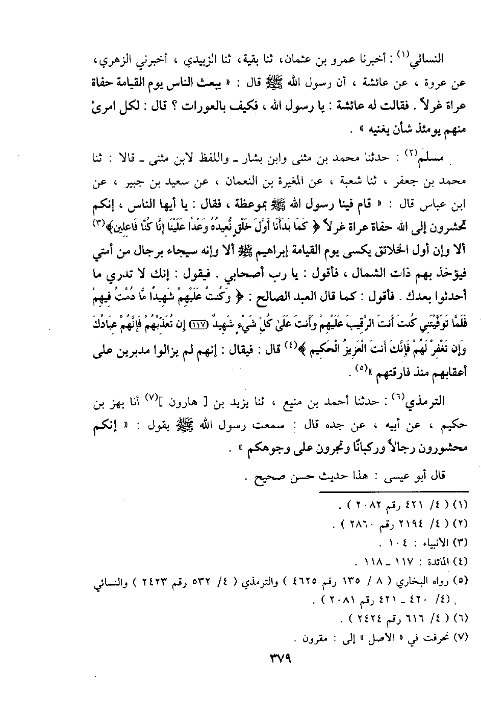 مُسلم: حَدثنَا مُحَمَّد بن مثنى وَابْن بشار - وَاللَّفْظ لِابْنِ مثنى - قَالَا: ثَنَا مُحَمَّد بن جَعْفَر، ثَنَا شُعْبَة، عَن الْمُغيرَة بن النُّعْمَان، عَن سعيد بن جُبَير، عَن ابْن عَبَّاس قَالَ: " قَامَ فِينَا رَسُول الله - صَلَّى اللَّهُ عَلَيْهِ وَسَلَّم َ - بموعظة، فَقَالَ: يَا أَيهَا النَّاس، إِنَّكُم تحشرون إِلَى الله حُفَاة عُرَاة غرلًا {كَمَا بدأنا أول خلق نعيده وَعدا علينا إِنَّا كُنَّا فاعلين} أَلا وَإِن أول الْخَلَائق يكسى يَوْم الْقِيَامَة إِبْرَاهِيم - صَلَّى اللَّهُ عَلَيْهِ وَسَلَّم َ - أَلا وَإنَّهُ سيجاء بِرِجَال من أمتِي فَيُؤْخَذ بهم ذَات الشمَال، فَأَقُول: يَا رب أَصْحَابِي. فَيَقُول: إِنَّك لَا تَدْرِي مَا أَحْدَثُوا بعْدك. فَأَقُول: كَمَا قَالَ العَبْد الصَّالح: {وَكنت عَلَيْهِم شَهِيدا مَا دمت فيهم فَلَمَّا توفيتني كنت أَنْت الرَّقِيب عَلَيْهِم وَأَنت على كل شَيْء شَهِيد إِن تُعَذبهُمْ فَإِنَّهُم عِبَادك وَإِن تغْفر لَهُم فَإنَّك أَنْت الْعَزِيز الْحَكِيم} قَالَ: فَيُقَال: إِنَّهُم لم يزَالُوا مُدبرين على أَعْقَابهم مُنْذُ فَارَقْتهمْ ".