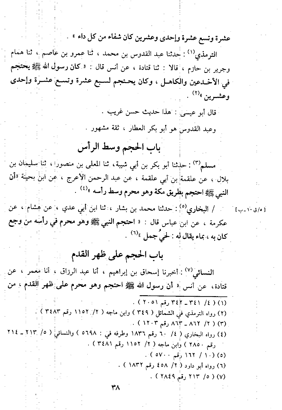 التِّرْمِذِيّ: حَدثنَا عبد القدوس بن مُحَمَّد، ثَنَا عَمْرو بن عَاصِم، ثَنَا همام وَجَرِير بن حَازِم، قَالَا: ثَنَا قَتَادَة، عَن أنس قَالَ: " كَانَ رَسُول الله - صَلَّى اللَّهُ عَلَيْهِ وَسَلَّم َ - يحتجم فِي الأخدعين والكاهل، وَكَانَ يحتجم لسبع عشرَة وتسع عشرَة وَإِحْدَى وَعشْرين ".