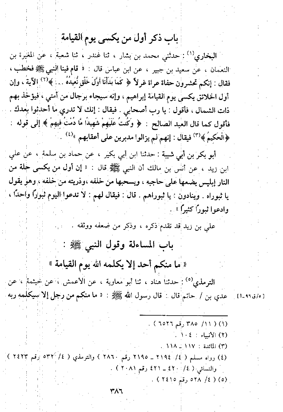 التِّرْمِذِيّ: حَدثنَا هناد، ثَنَا أَبُو مُعَاوِيَة، عَن الْأَعْمَش، عَن خَيْثَمَة، عَن عدي بن حَاتِم قَالَ: قَالَ رَسُول الله - صَلَّى اللَّهُ عَلَيْهِ وَسَلَّم َ -: " مَا مِنْكُم من رجل إِلَّا سيكلمه ربه