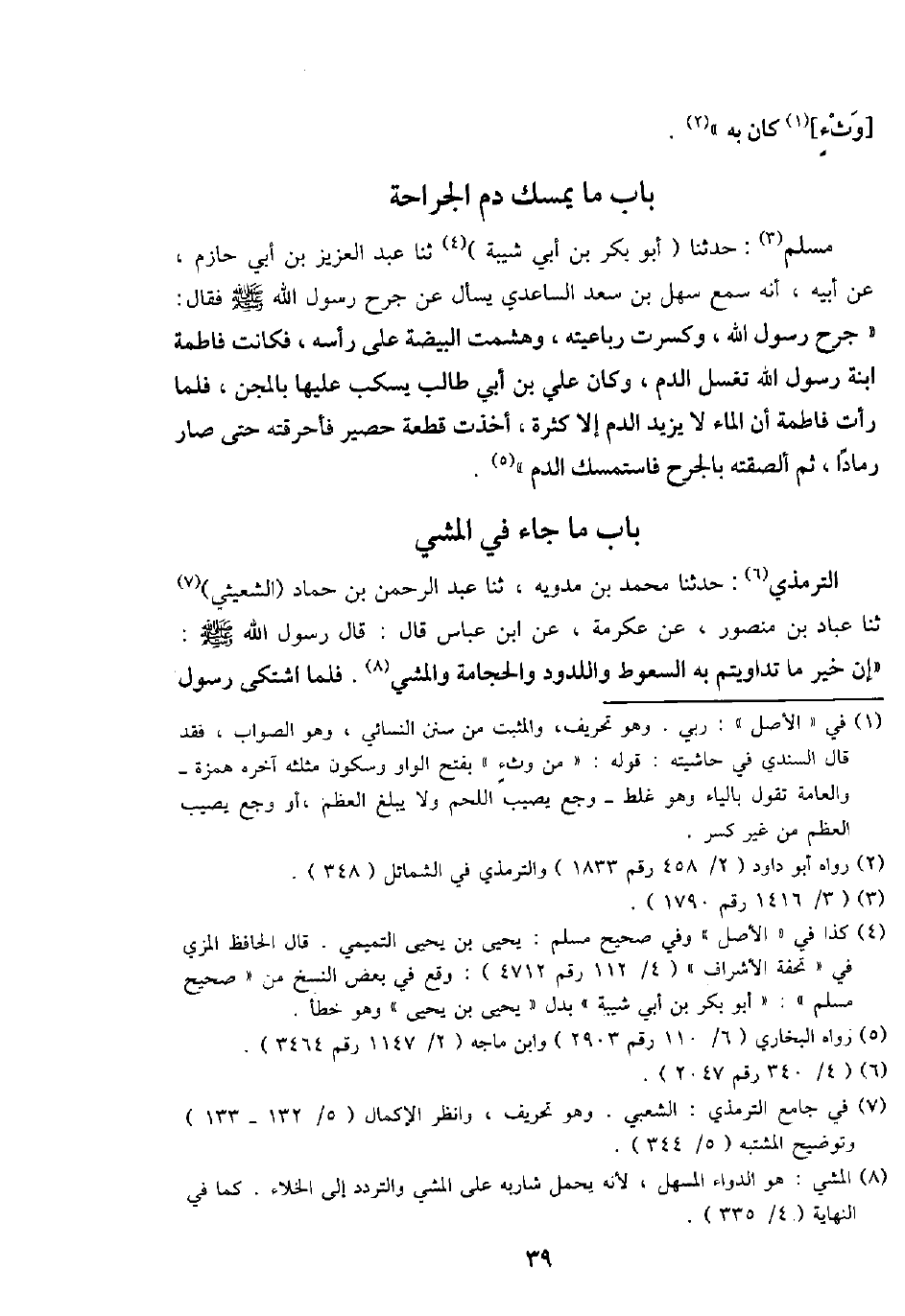 مُسلم: حَدثنَا (أَبُو بكر بن أبي شيبَة) ثَنَا عبد الْعَزِيز بن أبي حَازِم، عَن أَبِيه، أَنه سمع سهل بن سعد السَّاعِدِيّ يسْأَل عَن جرح رَسُول الله - صَلَّى اللَّهُ عَلَيْهِ وَسَلَّم َ - فَقَالَ: " جرح رَسُول الله، وَكسرت رباعيته، وهشمت الْبَيْضَة على رَأسه، فَكَانَت فَاطِمَة ابْنة رَسُول الله تغسل الدَّم، وَكَانَ عَليّ بن أبي طَالب يسْكب عَلَيْهَا بالمجن، فَلَمَّا رَأَتْ فَاطِمَة أَن المَاء لَا يزِيد الدَّم إِلَّا كَثْرَة، أخذت قِطْعَة حَصِير فَأَحْرَقتهُ حَتَّى صَار رَمَادا، ثمَّ أَلْصَقته بِالْجرْحِ فَاسْتَمْسك الدَّم ".