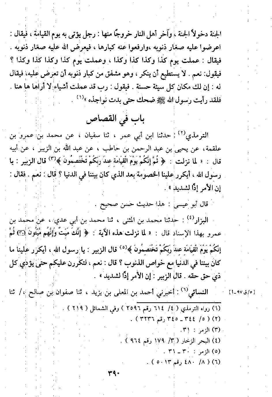 التِّرْمِذِيّ: حَدثنَا ابْن أبي عمر، ثَنَا سُفْيَان، عَن مُحَمَّد بن عَمْرو بن عَلْقَمَة، عَن يحيى بن عبد الرَّحْمَن بن حَاطِب، عَن عبد الله بن الزبير، عَن أَبِيه قَالَ: " لما نزلت: {ثمَّ إِنَّكُم يَوْم الْقِيَامَة عِنْد ربكُم تختصمون} قَالَ الزبير: يَا رَسُول الله، أيكرر علينا الْخُصُومَة بعد الَّذِي كَانَ بَيْننَا فِي الدُّنْيَا؟ قَالَ: نعم. فَقَالَ: إِن الْأَمر إِذا لشديد ".