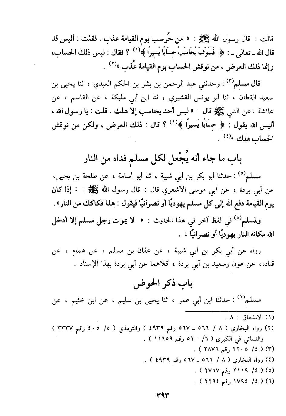 قَالَ مُسلم: وحَدثني عبد الرَّحْمَن بن بشر بن الحكم الْعَبْدي، ثَنَا يحيى بن سعيد الْقطَّان، ثَنَا أَبُو يُونُس الْقشيرِي، ثَنَا ابْن أبي مليكَة، عَن الْقَاسِم، عَن عَائِشَة، عَن النَّبِي - صَلَّى اللَّهُ عَلَيْهِ وَسَلَّم َ - قَالَ: " لَيْسَ أحد يُحَاسب إِلَّا هلك. قلت: يَا رَسُول الله، أَلَيْسَ الله يَقُول: {حسابا يَسِيرا} ؟ قَالَ: ذَلِك الْعرض، وَلَكِن من نُوقِشَ الْحساب هلك ".