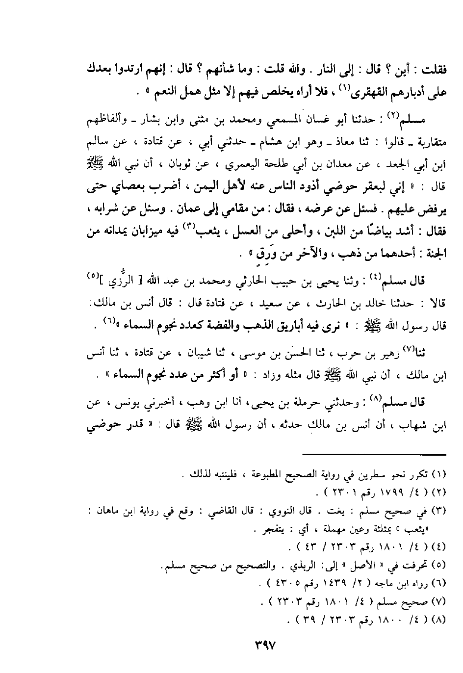 قَالَ مُسلم: وثنا يحيى بن حبيب الْحَارِثِيّ وَمُحَمّد بن عبد الله [الرزي] قَالَا: حَدثنَا خَالِد بن الْحَارِث، عَن سعيد، عَن قَتَادَة قَالَ: قَالَ أنس بن مَالك: قَالَ رَسُول الله - صَلَّى اللَّهُ عَلَيْهِ وَسَلَّم َ -: " نرى فِيهِ أَبَارِيق الذَّهَب وَالْفِضَّة كعدد نُجُوم السَّمَاء ".