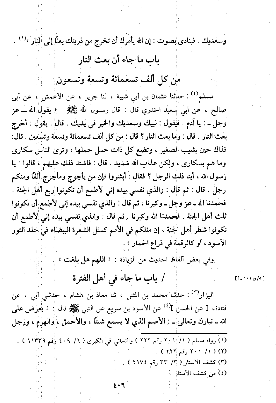 مُسلم: حَدثنَا عُثْمَان بن أبي شيبَة، ثَنَا جرير، عَن الْأَعْمَش، عَن أبي صَالح، عَن أبي سعيد الْخُدْرِيّ قَالَ: قَالَ رَسُول الله - صَلَّى اللَّهُ عَلَيْهِ وَسَلَّم َ -: " يَقُول الله - عز وَجل -: يَا آدم. فَيَقُول: لبيْك وَسَعْديك وَالْخَيْر فِي يَديك. قَالَ: يَقُول: أخرج بعث النَّار. قَالَ: وَمَا بعث النَّار؟ قَالَ: من كل ألف تِسْعمائَة وَتِسْعَة وَتِسْعين. قَالَ: فَذَاك حِين يشيب الصَّغِير، وتضع كل ذَات حمل حملهَا، وَترى النَّاس سكارى وَمَا هم بسكارى، وَلَكِن عَذَاب الله شَدِيد. قَالَ: فَاشْتَدَّ ذَلِك عَلَيْهِم، قَالُوا: يَا رَسُول الله، أَيّنَا ذَلِك الرجل؟ فَقَالَ: أَبْشِرُوا فَإِن من يَأْجُوج وَمَأْجُوج ألفا ومنكم رجل. قَالَ: ثمَّ قَالَ: وَالَّذِي نَفسِي بِيَدِهِ إِنِّي لأطمع أَن تَكُونُوا ربع أهل الْجنَّة. فحمدنا الله - عز وَجل - وَكَبَّرْنَا، ثمَّ قَالَ: وَالَّذِي نَفسِي بِيَدِهِ إِنِّي لأطمع أَن تَكُونُوا ثلث أهل الْجنَّة. فحمدنا الله وَكَبَّرْنَا. ثمَّ قَالَ: وَالَّذِي نَفسِي بِيَدِهِ إِنِّي لأطمع أَن تَكُونُوا شطر أهل الْجنَّة، إِن مثلكُمْ فِي الْأُمَم كَمثل الشعرة الْبَيْضَاء فِي جلده الثور الْأسود، أَو كالرقمة فِي ذِرَاع الْحمار ".