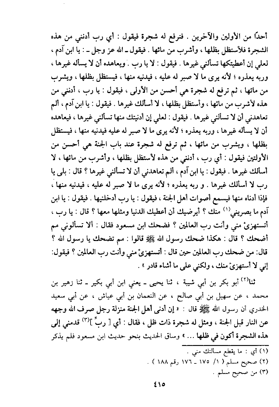 ثَنَا أَبُو بكر بن أبي شيبَة، ثَنَا يحيى - يَعْنِي ابْن أبي بكير - ثَنَا زُهَيْر بن مُحَمَّد، عَن سُهَيْل بن أبي صَالح، عَن النُّعْمَان بن أبي عَيَّاش، عَن أبي سعيد الْخُدْرِيّ أَن رَسُول الله - صَلَّى اللَّهُ عَلَيْهِ وَسَلَّم َ - قَالَ: " إِن أدنى أهل الْجنَّة منزلَة رجل صرف الله وَجهه عَن النَّار قبل الْجنَّة، وَمثل لَهُ شَجَرَة ذَات ظلّ، فَقَالَ: أَي [رب] قدمني إِلَى هَذِه الشَّجَرَة أكون فِي ظلها ... " وسَاق الحَدِيث بِنَحْوِ حَدِيث ابْن مَسْعُود فَلم يذكر