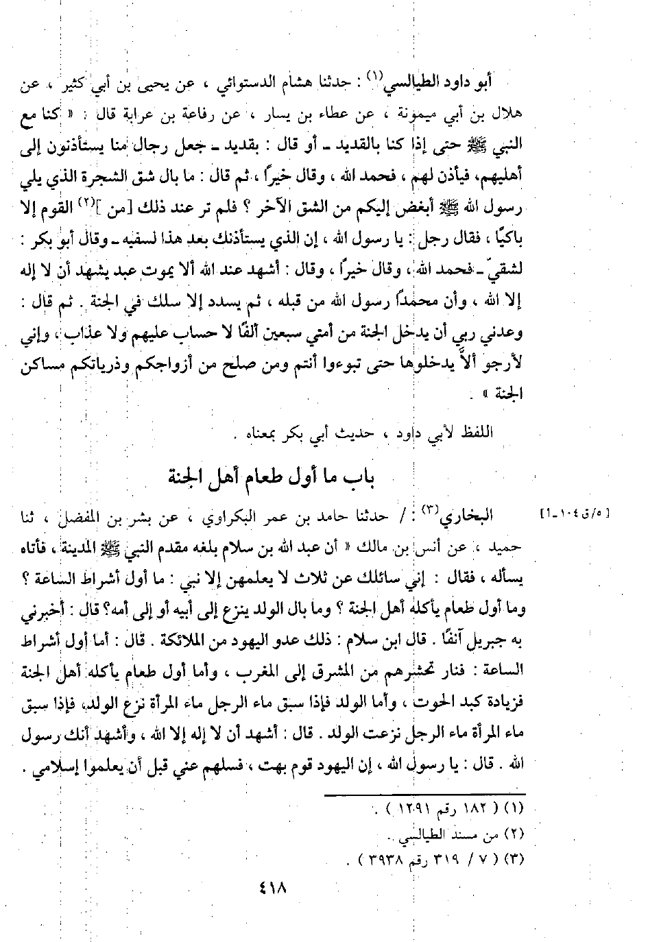 البُخَارِيّ: حَدثنَا حَامِد بن عمر البكراوي، عَن بشر بن الْمفضل، ثَنَا حميد، عَن أنس بن مَالك " أَن عبد الله بن سَلام بلغه مقدم النَّبِي - صَلَّى اللَّهُ عَلَيْهِ وَسَلَّم َ - الْمَدِينَة، فَأَتَاهُ يسْأَله، فَقَالَ: إِنِّي سَائِلك عَن ثَلَاث لَا يعلمهُنَّ إِلَّا نَبِي: مَا أول أَشْرَاط السَّاعَة؟ وَمَا أول طَعَام يَأْكُلهُ أهل الْجنَّة؟ وَمَا بَال الْوَلَد ينْزع إِلَى أَبِيه أَو إِلَى أمه؟ قَالَ: أَخْبرنِي بِهِ جِبْرِيل آنِفا. قَالَ ابْن سَلام: ذَلِك عَدو الْيَهُود من الْمَلَائِكَة. قَالَ: أما أول أَشْرَاط السَّاعَة: فَنَار تَحْشُرهُمْ من الْمشرق إِلَى الْمغرب، وَأما أول طَعَام يَأْكُلهُ أهل الْجنَّة فَزِيَادَة كبد الْحُوت، وَأما الْوَلَد فَإِذا سبق مَاء الرجل مَاء الْمَرْأَة نزع الْوَلَد، فَإِذا سبق مَاء الْمَرْأَة مَاء الرجل نزعت الْوَلَد. قَالَ: أشهد أَن لَا إِلَه إِلَّا الله، وَأشْهد أَنَّك رَسُول الله. قَالَ: يَا رَسُول الله، إِن الْيَهُود قوم بهت، فَسلم عني قبل أَن يعلمُوا إسلامي.