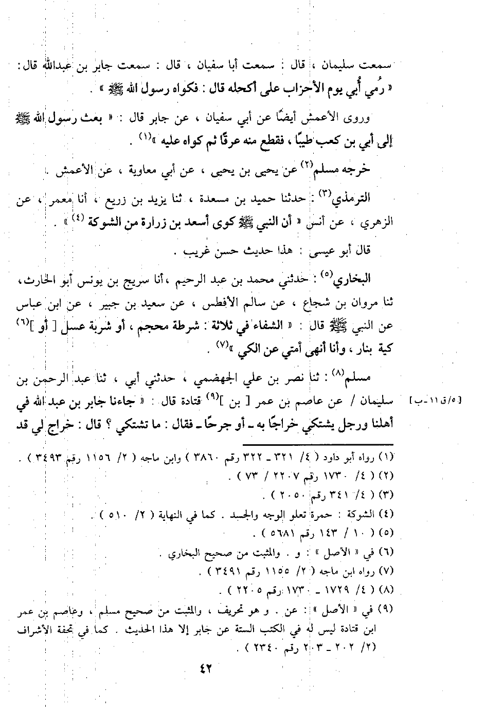 سَمِعت سُلَيْمَان، قَالَ: سَمِعت أَبَا سُفْيَان، قَالَ: سَمِعت جَابر بن عبد الله قَالَ: " رمي أبي يَوْم الْأَحْزَاب على أكحله قَالَ: فكواه رَسُول الله - صَلَّى اللَّهُ عَلَيْهِ وَسَلَّم َ - ".