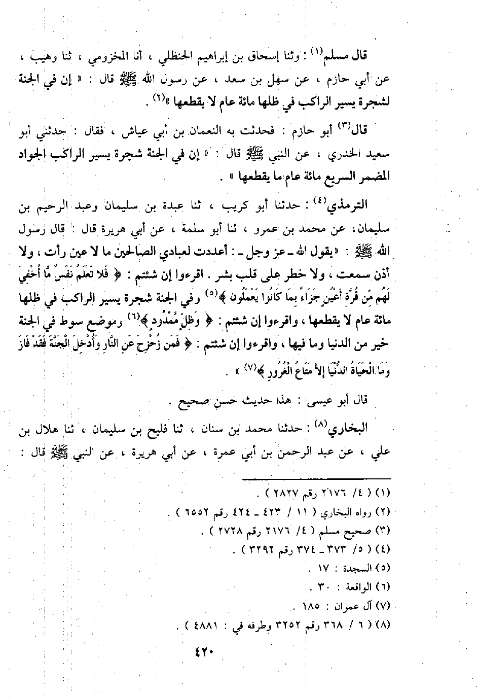 التِّرْمِذِيّ: حَدثنَا أَبُو كريب، ثَنَا عَبدة بن سُلَيْمَان وَعبد الرَّحِيم بن سُلَيْمَان، عَن مُحَمَّد بن عَمْرو، ثَنَا أَبُو سَلمَة، عَن أبي هُرَيْرَة قَالَ: قَالَ رَسُول الله - صَلَّى اللَّهُ عَلَيْهِ وَسَلَّم َ -: " يَقُول الله - عز وَجل -: أَعدَدْت لعبادي الصَّالِحين مَا لَا عين رَأَتْ، وَلَا أذن سَمِعت، وَلَا خطر على قلب بشر. اقْرَءُوا إِن شِئْتُم: {فَلَا تعلم نفس مَا أُخْفِي لَهُم من قُرَّة أعين جَزَاء بِمَا كَانُوا يعْملُونَ} وَفِي الْجنَّة شَجَرَة يسير الرَّاكِب فِي ظلها مائَة عَام لَا يقطعهَا، واقرءوا إِن شِئْتُم: {وظل مَمْدُود} وَمَوْضِع سَوط فِي الْجنَّة خير من الدُّنْيَا وَمَا فِيهَا، واقرءوا إِن شِئْتُم: ^) فَمن زحزح عَن النَّار وَأدْخل الْجنَّة فقد فَازَ وَمَا الْحَيَاة الدُّنْيَا إِلَّا مَتَاع الْغرُور} ".