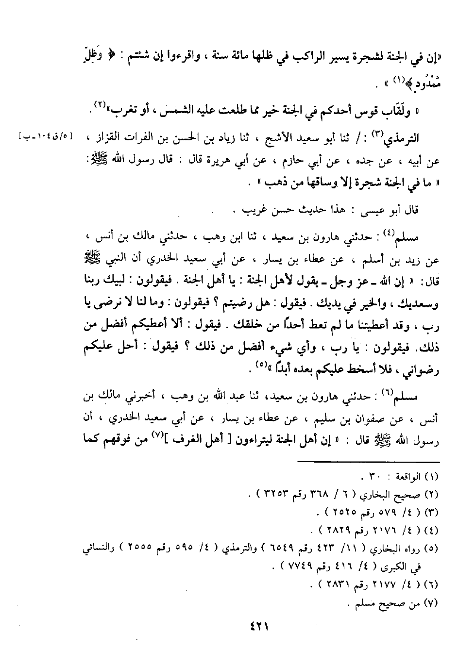 مُسلم: حَدثنِي هَارُون بن سعيد، ثَنَا عبد الله بن وهب، أَخْبرنِي مَالك بن أنس، عَن صَفْوَان بن سليم، عَن عَطاء بن يسَار، عَن أبي سعيد الْخُدْرِيّ، أَن رَسُول الله - صَلَّى اللَّهُ عَلَيْهِ وَسَلَّم َ - قَالَ: " إِن أهل الْجنَّة ليتراءون [أهل الغرف] من فَوْقهم كَمَا