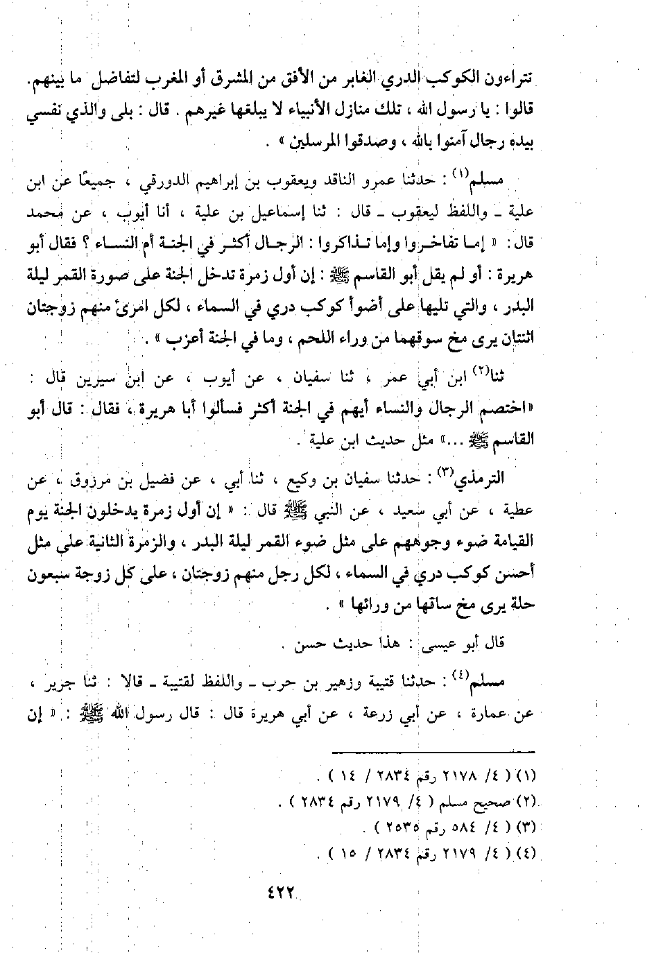 مُسلم: حَدثنَا عَمْرو النَّاقِد وَيَعْقُوب بن إِبْرَاهِيم الدَّوْرَقِي، جَمِيعًا عَن ابْن علية - وَاللَّفْظ ليعقوب - قَالَ: ثَنَا إِسْمَاعِيل بن علية، أَنا أَيُّوب، عَن مُحَمَّد قَالَ: " إِمَّا تفاخروا وَإِمَّا تَذَاكَرُوا: الرِّجَال أَكثر فِي الْجنَّة أم النِّسَاء؟ فَقَالَ أَبُو هُرَيْرَة: أَو لم يقل أَبُو الْقَاسِم - صَلَّى اللَّهُ عَلَيْهِ وَسَلَّم َ -: إِن أول زمرة تدخل الْجنَّة على صُورَة الْقَمَر لَيْلَة الْبَدْر، وَالَّتِي تَلِيهَا على أَضْوَأ كَوْكَب دري فِي السَّمَاء، لكل امْرِئ مِنْهُم زوجتان اثْنَتَانِ يرى مخ سوقهما من وَرَاء اللَّحْم، وَمَا فِي الْجنَّة أعزب ".