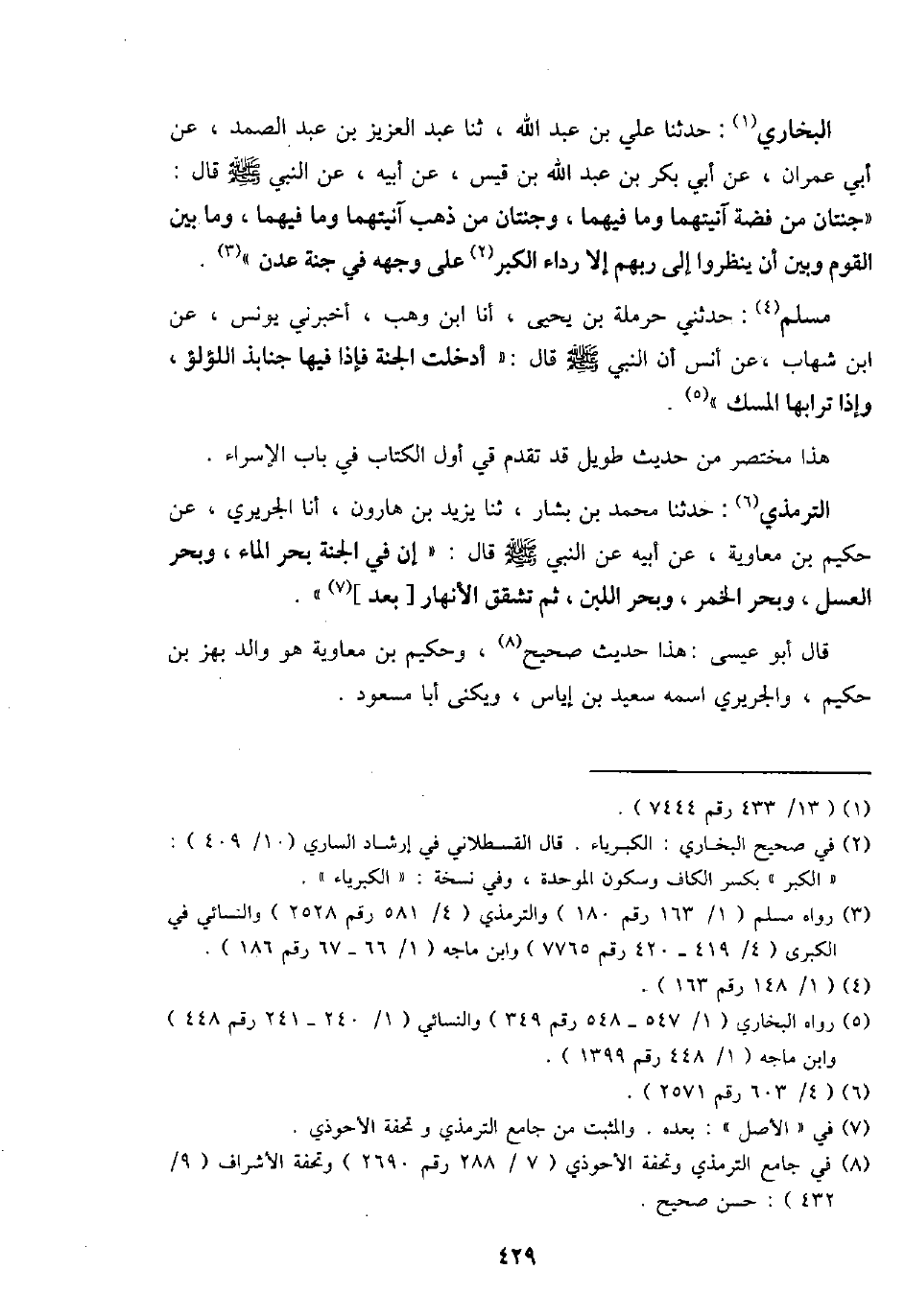 البُخَارِيّ: حَدثنَا عَليّ بن عبد الله، ثَنَا عبد الْعَزِيز بن عبد الصَّمد، عَن أبي عمرَان، عَن أبي بكر بن عبد الله بن قيس، عَن أَبِيه، عَن النَّبِي - صَلَّى اللَّهُ عَلَيْهِ وَسَلَّم َ - قَالَ: " جنتان من فضَّة آنيتهما وَمَا فيهمَا، وجنتان من ذهب آنيتهما وَمَا فيهمَا، وَمَا بَين الْقَوْم وَبَين أَن ينْظرُوا إِلَى رَبهم إِلَّا رِدَاء الْكبر على وَجهه فِي جنَّة عدن ".