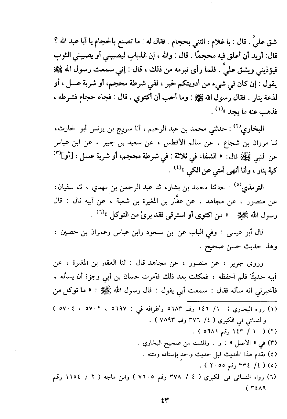 التِّرْمِذِيّ: حَدثنَا مُحَمَّد بن بشار، ثَنَا عبد الرَّحْمَن بن مهْدي، ثَنَا سُفْيَان، عَن مَنْصُور، عَن مُجَاهِد، عَن عقار بن الْمُغيرَة بن شُعْبَة، عَن أَبِيه قَالَ: قَالَ رَسُول الله - صَلَّى اللَّهُ عَلَيْهِ وَسَلَّم َ -: " من اكتوى أَو استرقى فقد برِئ من التَّوَكُّل ".