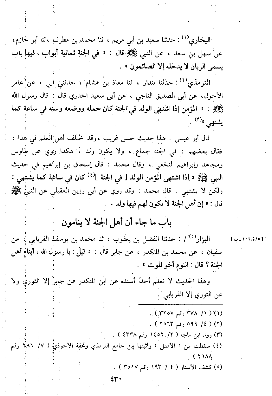 الْبَزَّار: حَدثنَا الْفضل بن يَعْقُوب، ثَنَا مُحَمَّد بن يُوسُف الْفرْيَابِيّ، عَن سُفْيَان، عَن مُحَمَّد بن الْمُنْكَدر، عَن جَابر قَالَ: " قيل: يَا رَسُول الله، أَيَنَامُ أهل الْجنَّة؟ قَالَ: النّوم أَخُو الْمَوْت ".