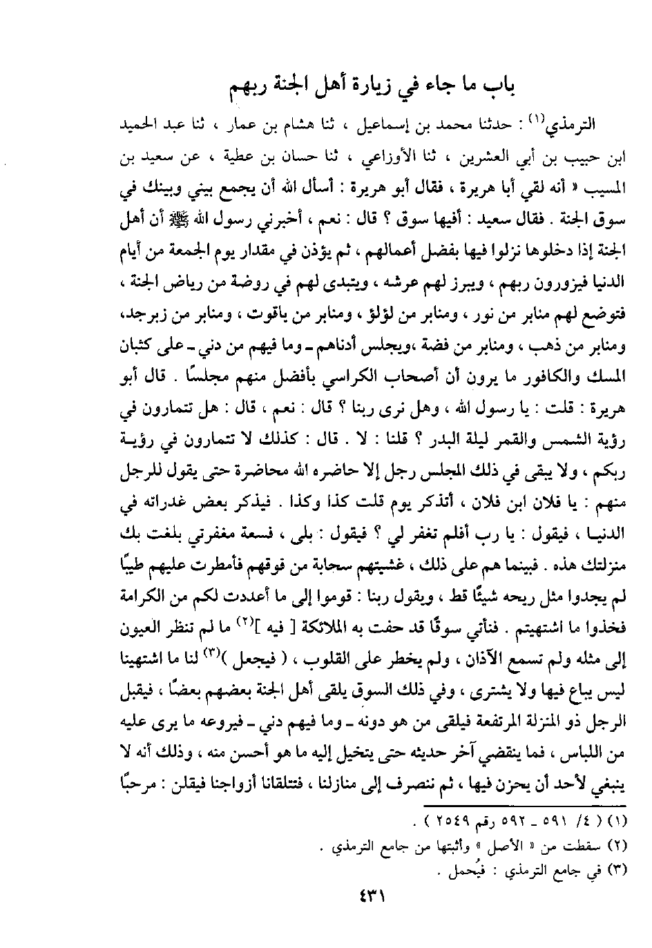 التِّرْمِذِيّ: حَدثنَا مُحَمَّد بن إِسْمَاعِيل، ثَنَا هِشَام بن عمار، ثَنَا عبد الحميد ابْن حبيب بن أبي الْعشْرين، ثَنَا الْأَوْزَاعِيّ، ثَنَا حسان بن عَطِيَّة، عَن سعيد بن الْمسيب " أَنه لَقِي أَبَا هُرَيْرَة، فَقَالَ أَبُو هُرَيْرَة: أسأَل الله أَن يجمع بيني وَبَيْنك فِي سوق الْجنَّة. فَقَالَ سعيد: أفيها سوق؟ قَالَ: نعم، أَخْبرنِي رَسُول الله - صَلَّى اللَّهُ عَلَيْهِ وَسَلَّم َ - أَن أهل الْجنَّة إِذا دخلوها نزلُوا فِيهَا بِفضل أَعْمَالهم، ثمَّ يُؤذن فِي مِقْدَار يَوْم الْجُمُعَة من أَيَّام الدُّنْيَا فيزورون رَبهم، ويبرز لَهُم عَرْشه، ويتبدى لَهُم فِي رَوْضَة من رياض الْجنَّة، فتوضع لَهُم مَنَابِر من نور، ومنابر من لُؤْلُؤ، ومنابر بن ياقوت، ومنابر من زبرجد، ومنابز من ذهب، ومنابر من فضَّة، وَيجْلس أَدْنَاهُم - وَمَا فيهم من دني - على كُثْبَان الْمسك والكافور أَن يرَوْنَ مَا أَصْحَاب الكراسي بِأَفْضَل مِنْهُم مَجْلِسا. قَالَ أَبُو هُرَيْرَة: قلت: يَا رَسُول الله، وَهل نرى رَبنَا؟ قَالَ: نعم، قَالَ: هَل تتمارون فِي رُؤْيَة الشَّمْس وَالْقَمَر لَيْلَة الْبَدْر؟ قُلْنَا: لَا. قَالَ: كَذَلِك لَا تتمارون فِي رُؤْيَة ربكُم، وَلَا يبْقى فِي ذَلِك الْمجْلس رجل إِلَّا حاضره الله محاضرة حَتَّى يَقُول للرجل مِنْهُم: يَا فلَان ابْن فلَان، أَتَذكر يَوْم قلت كَذَا وَكَذَا. فيذكر بعض غدراته فِي الدُّنْيَا، فَيَقُول: يَا رب أفلم تغْفر لي. فَيَقُول: بلَى، فسعة مغفرتي بلغت بك منزلتك هَذِه. فَبَيْنَمَا هم على ذَلِك، غشيتهم سَحَابَة من فَوْقهم فأمطرت عَلَيْهِم طيبا لم يَجدوا مثل رِيحه شَيْئا قطّ، وَيَقُول رَبنَا: قومُوا إِلَى مَا أَعدَدْت لكم من الْكَرَامَة فَخُذُوا مَا اشتهيتم. فنأتي سوقاً قد حفت بِهِ الْمَلَائِكَة [فِيهِ] مَا لم تنظر الْعُيُون إِلَى مثله وَلم تسمع الآذان، وَلم يخْطر على الْقُلُوب، (فَيجْعَل) لنا مَا اشتهينا لَيْسَ يُبَاع فِيهَا وَلَا يشترى، وَفِي ذَلِك السُّوق يلقى أهل الْجنَّة بَعضهم بَعْضًا، فَيقبل الرجل ذُو الْمنزلَة المرتفعة فَيلقى من هُوَ دونه - وَمَا فيهم دني - فيروعه مَا يرى عَلَيْهِ من اللبَاس، فَمَا يَنْقَضِي آخر حَدِيثه حَتَّى يتخيل إِلَيْهِ مَا هُوَ أحسن مِنْهُ، وَذَلِكَ أَنه لَا يَنْبَغِي لأحد أَن يحزن فِيهَا، ثمَّ ننصرف إِلَى مَنَازلنَا، فتتلقانا أَزوَاجنَا فيقلن: مرْحَبًا