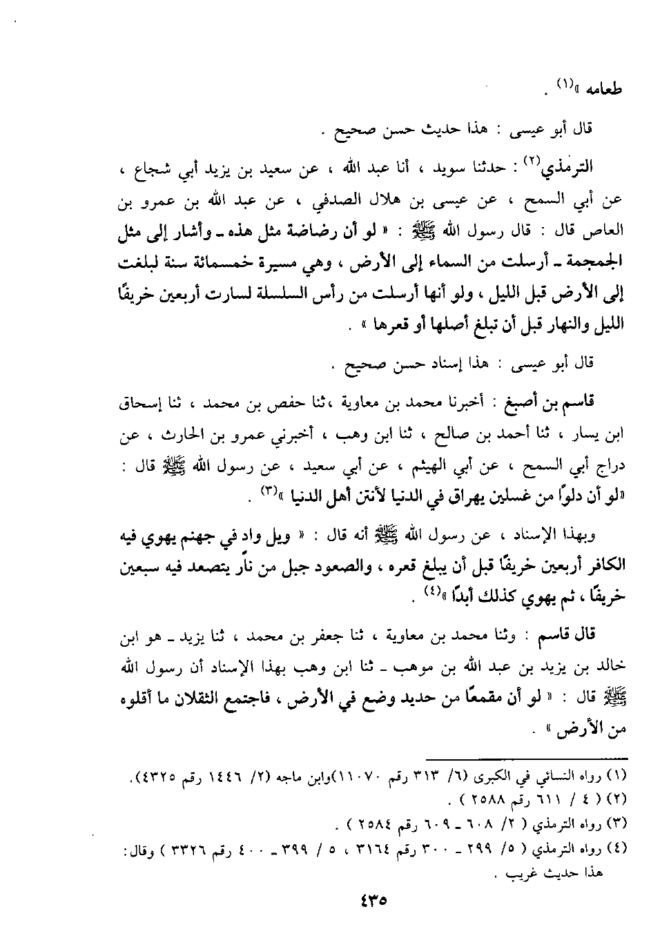 التِّرْمِذِيّ: حَدثنَا سُوَيْد، أَنا عبد الله، عَن سعيد بن يزِيد أبي شُجَاع، عَن أبي السَّمْح، عَن عِيسَى بن هِلَال الصَّدَفِي، عَن عبد الله بن عَمْرو بن الْعَاصِ قَالَ: قَالَ رَسُول الله - صَلَّى اللَّهُ عَلَيْهِ وَسَلَّم َ -: " لَو أَن رضاضة مثل هَذِه - وَأَشَارَ إِلَى مثل الجمجمة - أرْسلت من السَّمَاء إِلَى الأَرْض، وَهِي مسيرَة خَمْسمِائَة سنة لبلغت إِلَى الأَرْض قبل اللَّيْل، وَلَو أَنَّهَا أرْسلت من رَأس السلسلة لَسَارَتْ أَرْبَعِينَ خَرِيفًا اللَّيْل وَالنَّهَار قبل أَن تبلغ أَصْلهَا أَو قعرها ".