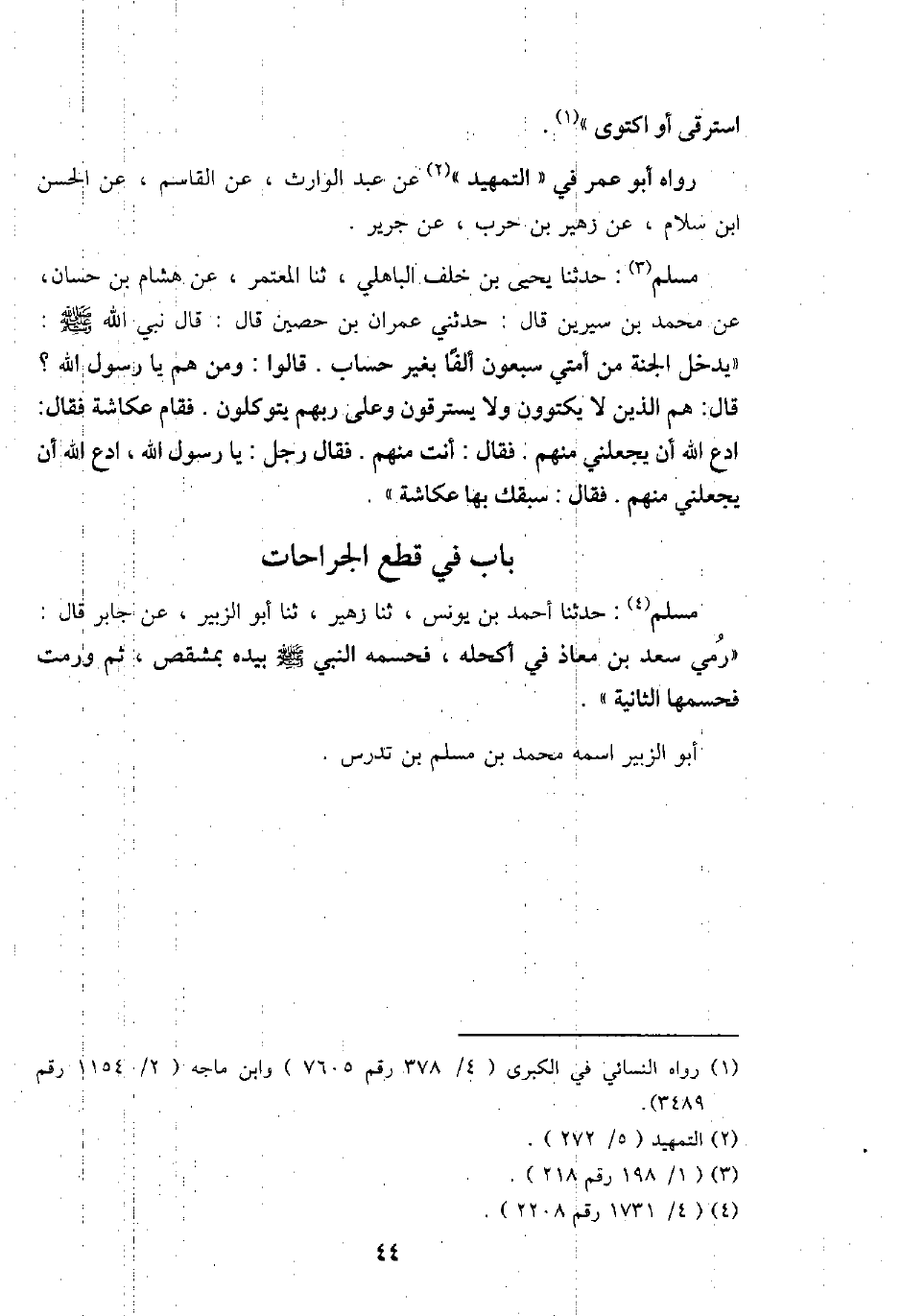 مُسلم: حَدثنَا يحيى بن خلف الْبَاهِلِيّ، ثَنَا الْمُعْتَمِر، عَن هِشَام بن حسان، عَن مُحَمَّد بن سِيرِين قَالَ: حَدثنِي عمرَان بن حُصَيْن قَالَ: قَالَ نَبِي الله - صَلَّى اللَّهُ عَلَيْهِ وَسَلَّم َ - " يدْخل الْجنَّة من أمتِي سَبْعُونَ ألفا بِغَيْر حِسَاب. قَالُوا: وَمن هم يَا رَسُول الله؟ قَالَ: هم الَّذين لَا يَكْتَوُونَ وَلَا يسْتَرقونَ وعَلى رَبهم يَتَوَكَّلُونَ. فَقَامَ عكاشة فَقَالَ: ادْع الله أَن يَجْعَلنِي مِنْهُم. فَقَالَ: أَنْت مِنْهُم. فَقَالَ رجل: يَا رَسُول الله، ادْع الله أَن يَجْعَلنِي مِنْهُم. فَقَالَ: سَبَقَك بهَا عكاشة ".