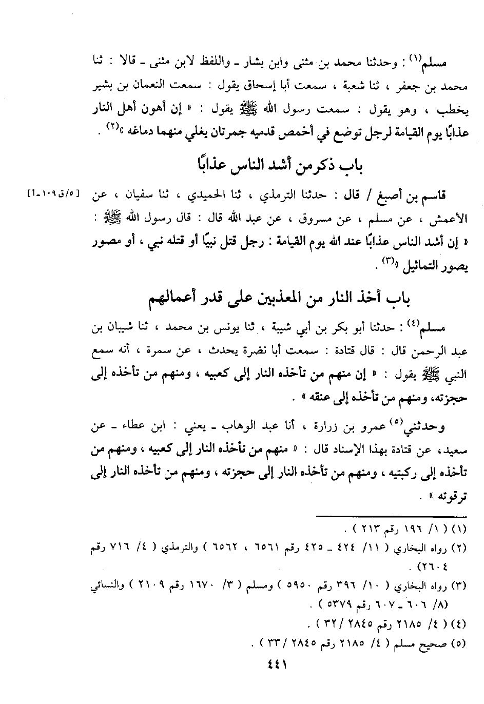 مُسلم: حَدثنَا أَبُو بكر بن أبي شيبَة، ثَنَا يُونُس بن مُحَمَّد، ثَنَا شَيبَان بن عبد الرَّحْمَن قَالَ: قَالَ قَتَادَة: سَمِعت أَبَا نَضرة يحدث، عَن سَمُرَة، أَنه سمع النَّبِي - صَلَّى اللَّهُ عَلَيْهِ وَسَلَّم َ - يَقُول: " إِن مِنْهُم من تَأْخُذهُ النَّار إِلَى كعبيه، وَمِنْهُم من تَأْخُذهُ إِلَى حجزته، وَمِنْهُم من تَأْخُذهُ إِلَى عُنُقه ".